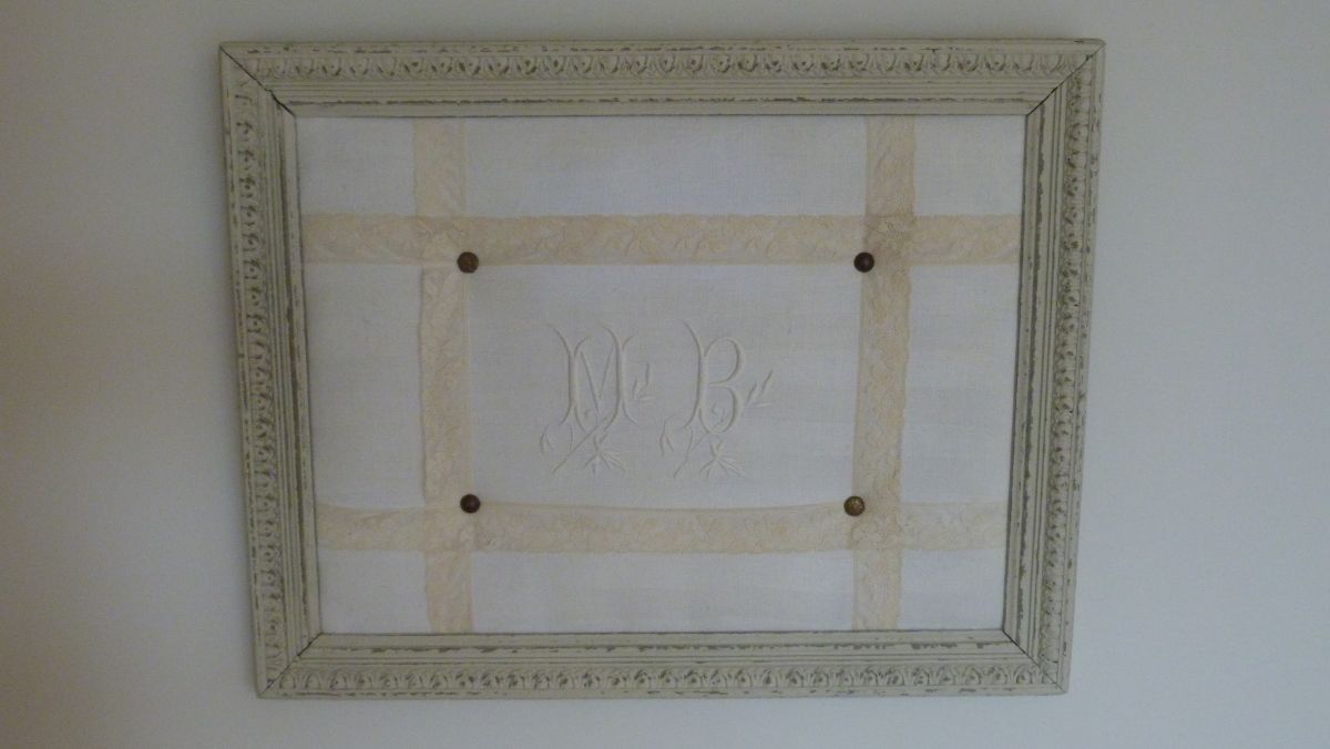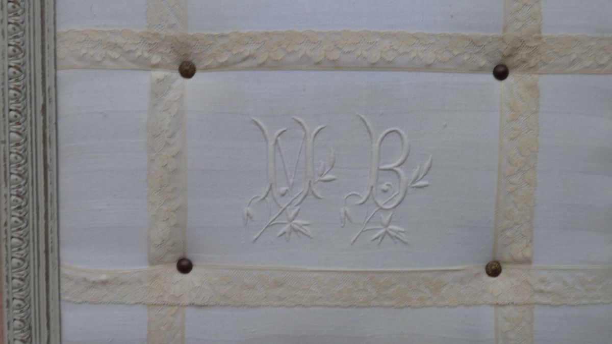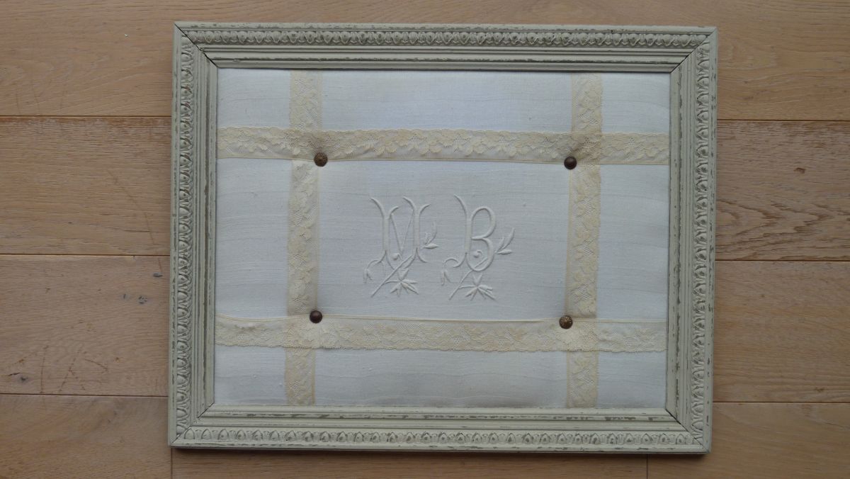 Cadre en bois ancien patiné de gris, linge en lin monogrammé "M & B", dentelle et clous vintage.