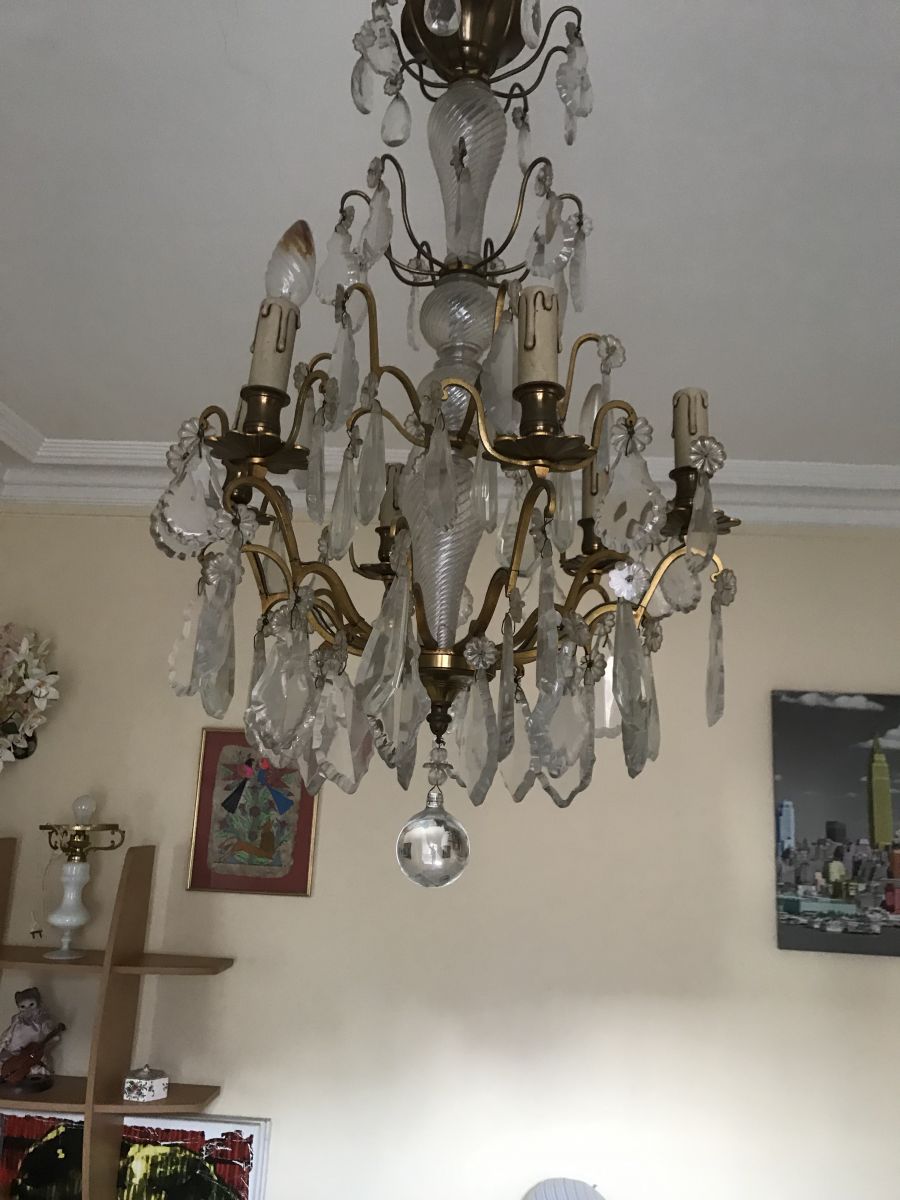 lustre avec ses deux appliques à pampilles fabrication 1960 rien ne manque vente suite vente maison, rien de cassé, bronze, je n'ai pas le prix d'achat de l'époque acheté dans le faugbourg Saint Antoine, je peux l'envoyer emballé ou le livrer, je ne connais pas le prix de l'envoie, il y a trois lustres