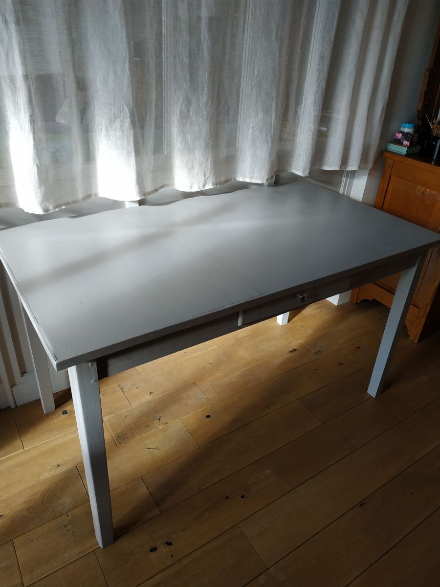 Grande table rénovée, repeinte en gris avec une couche de vernis mat (qui ne modifie pas la couleur et l'aspect de la peinture) pour éviter les taches d'eau. Bouton métallique pour le tiroir. Peut servir de bureau ou de table à manger.