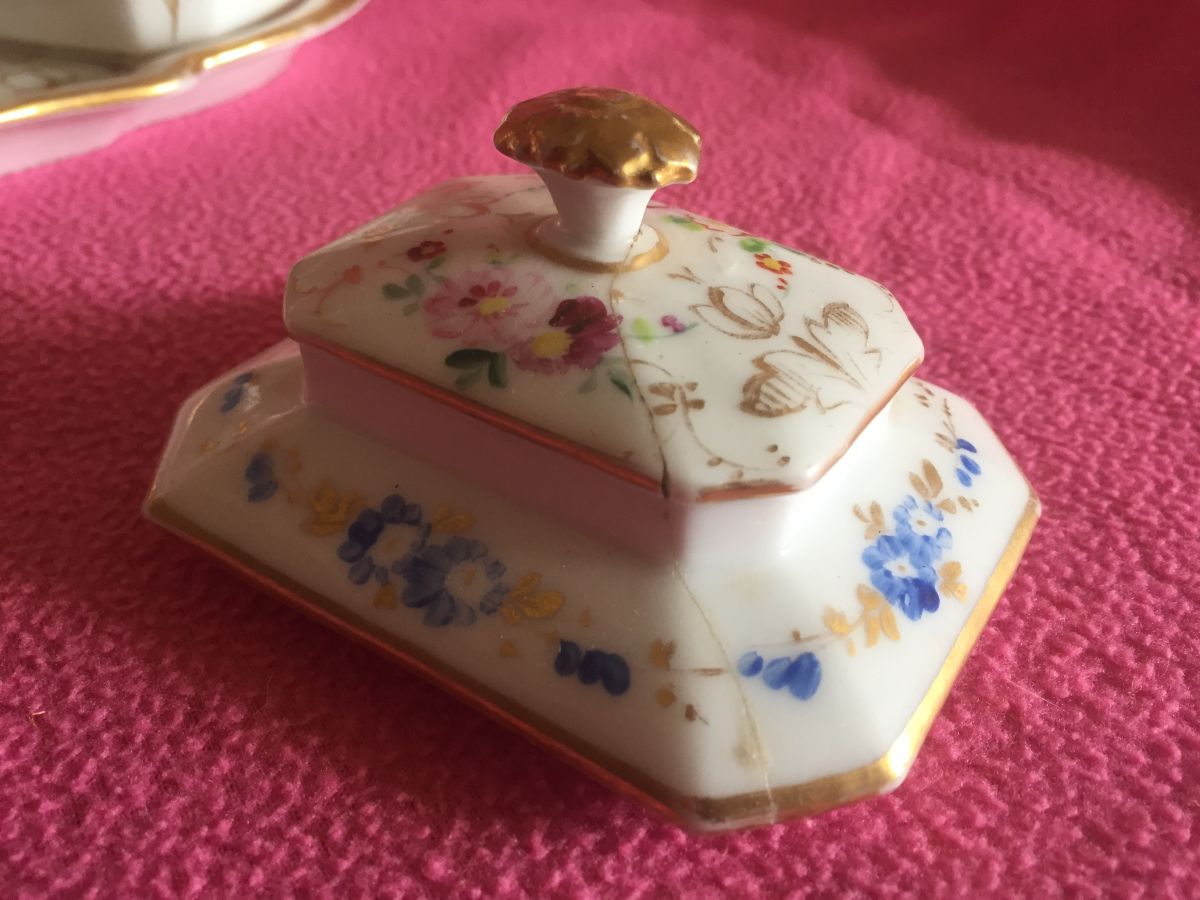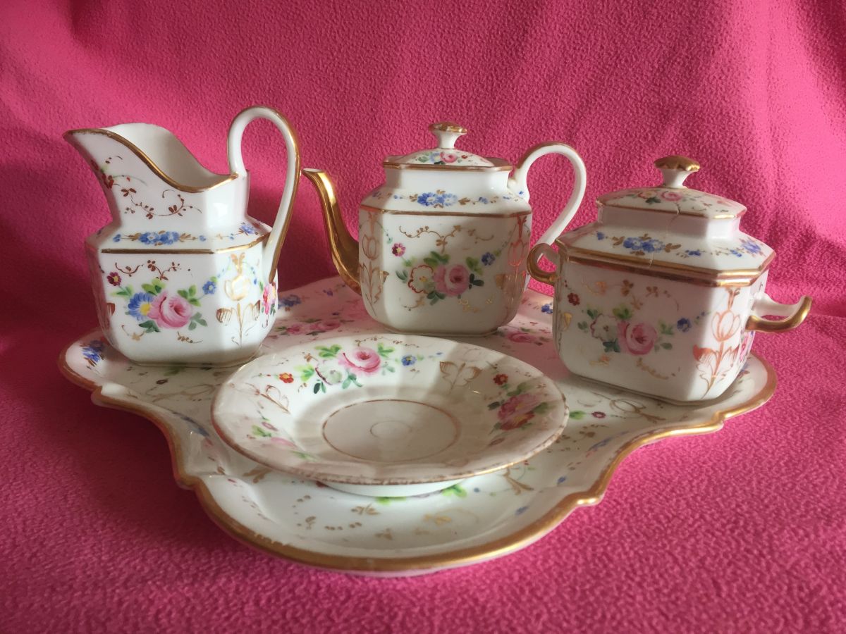 plateau, verseuse, pot à lait, sucrier et coupelle. Une petite fêlure sur un chapeau.