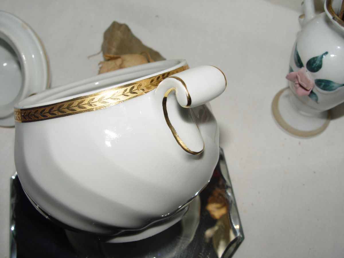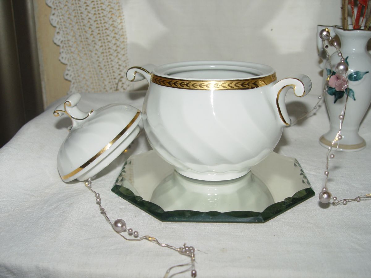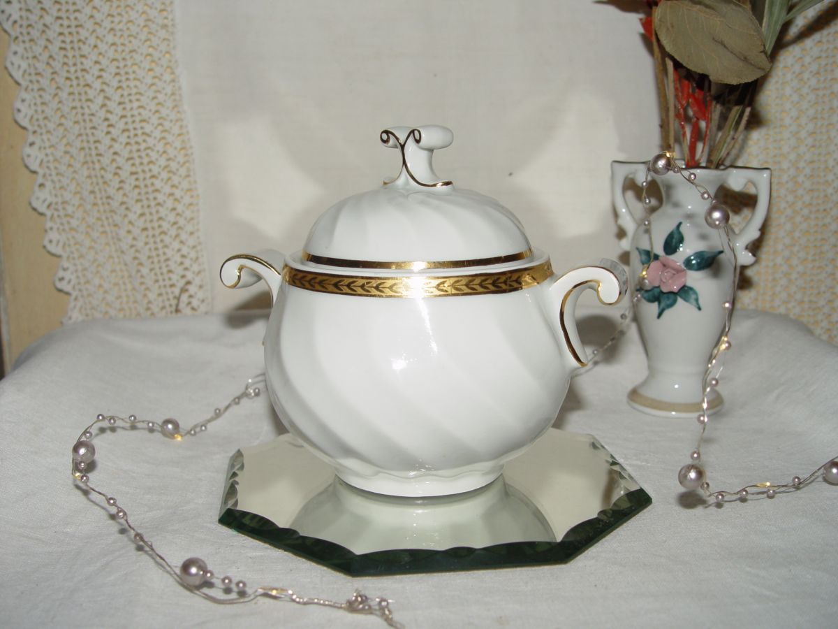 Très délicat sucrier en porcelaine française - blanche à liseré et frise d'or - estampillé "porcelaine de luxe de la compagnie nationale" manufacture située à Vierzon.