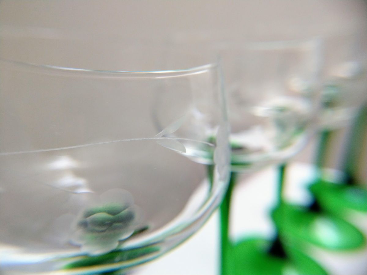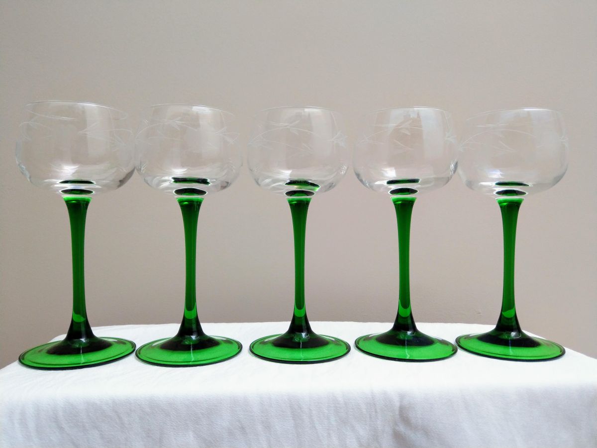 5 verres à vin d'Alsace décorés de motifs grappes.