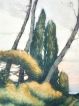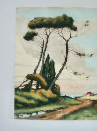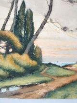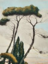 Tableau ancien datant des années 40, pin maritime et cyprès faisant écrin à la mer et aux voiliers. Technique mixte encre, pastel, aquarelle sur papier, en très bon état.