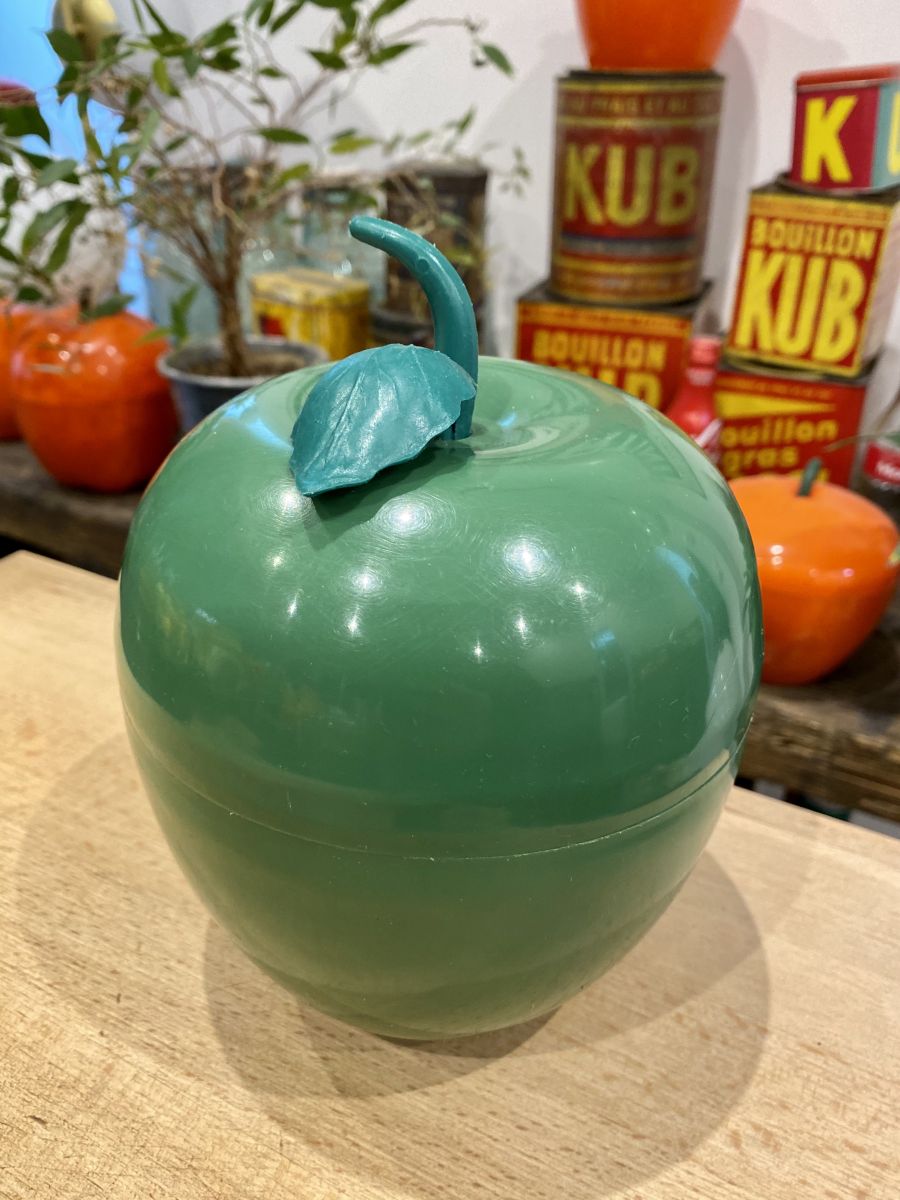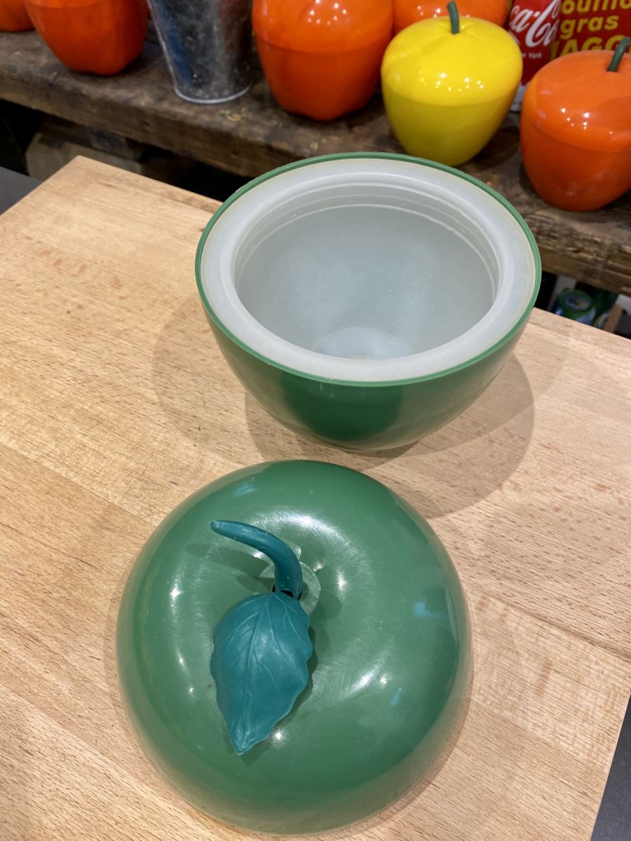 Authentique pomme bac à glaçons des années 70 verte. Intérieur plastique isolant typique des seventies. Très bon état. Hauteur 18 cm diamètre 15 cm.
