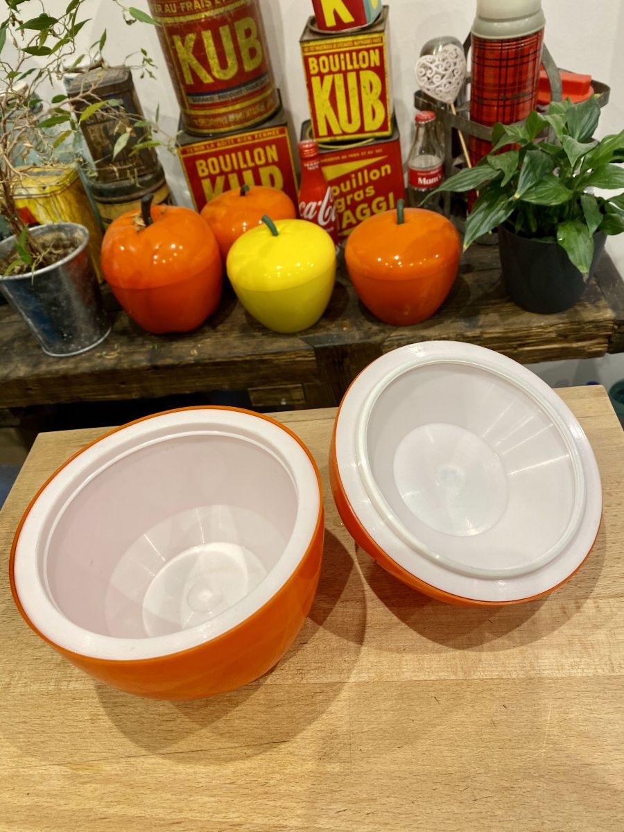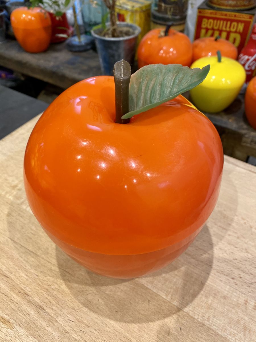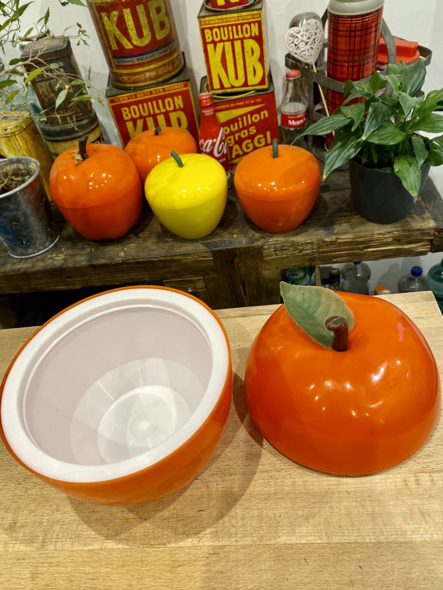 Authentique pomme bac à glaçons des années 70 orange. Intérieur plastique blanc isolant typique des seventies. Très bon état. Hauteur 18 cm diamètre 15 cm.