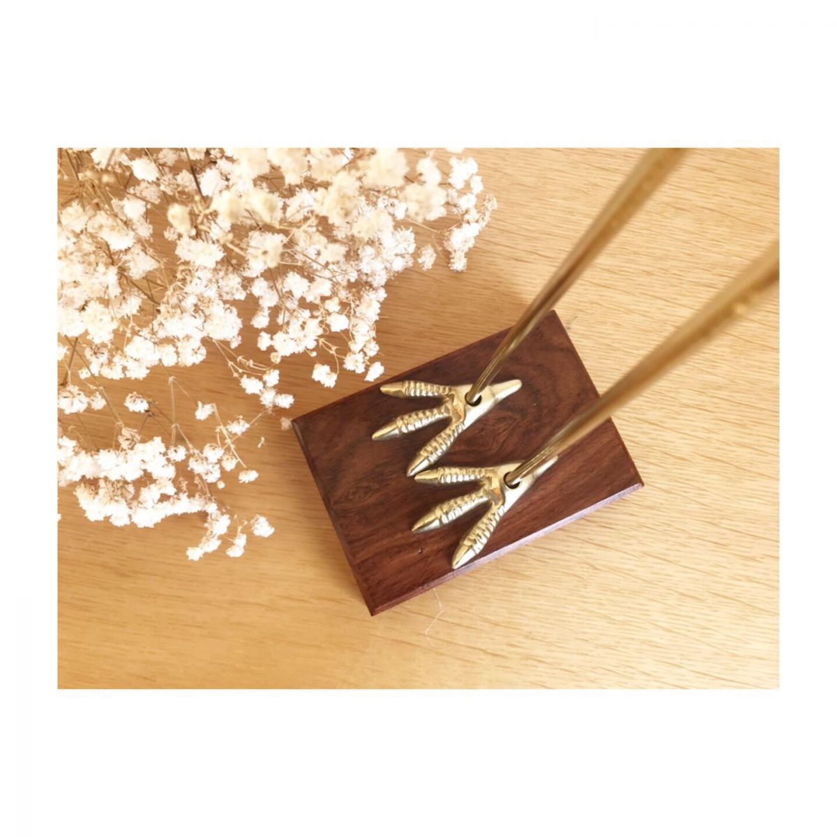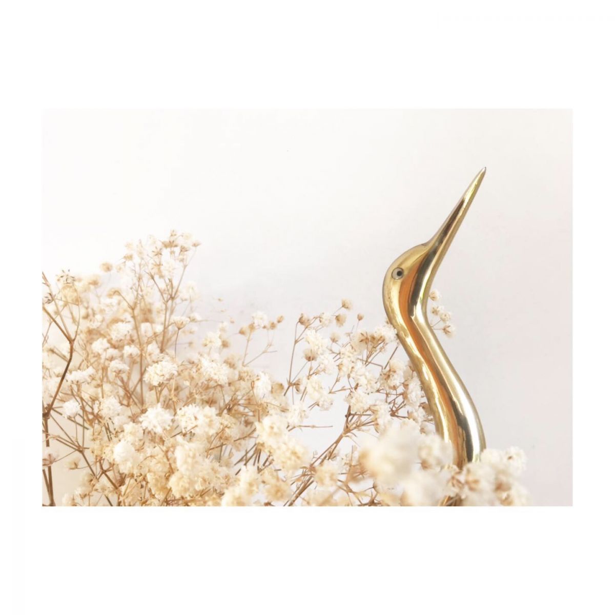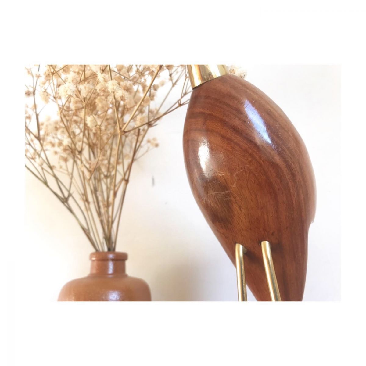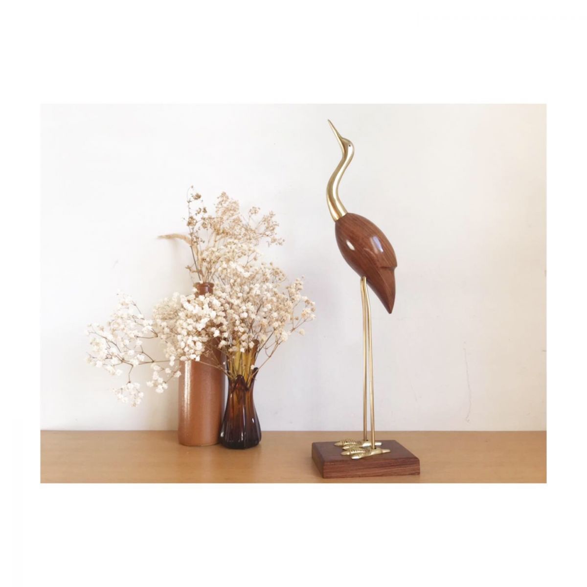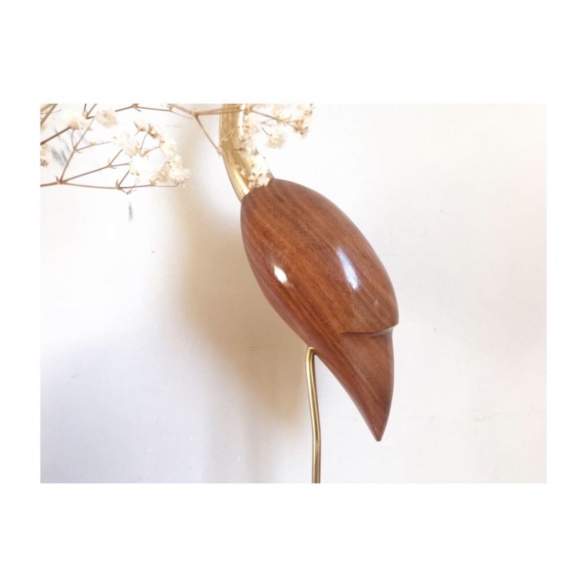 En bi -matière, ce héron en bois et laiton est posé sur un socle en bois et délicatement clouté en ses pattes.
