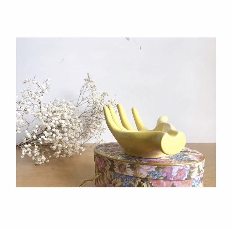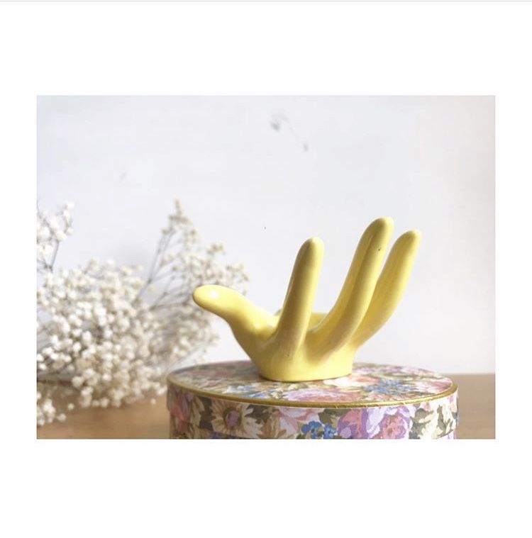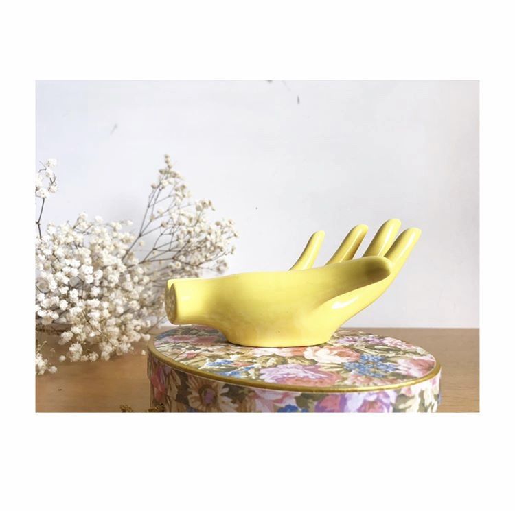 En céramique, cette jolie main vide poche/porté-bijoux, d’une couleur jaune tendre est en très bel état.