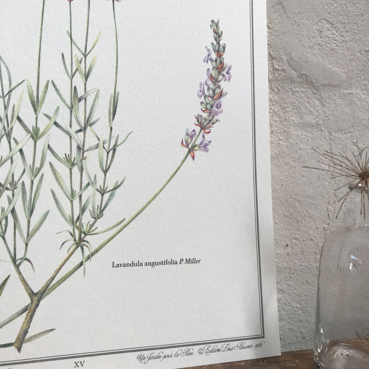 Planche botanique "lavande", issue de la collection "Un jardin pour la peau", éditions Pariente (1986), pastel de Christian Michaut et calligraphie de Patrick Benoistel.