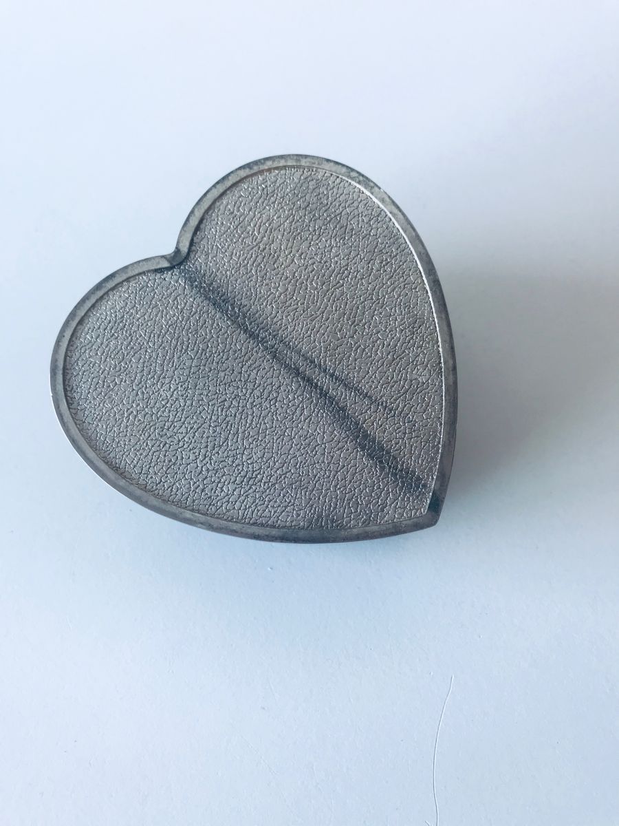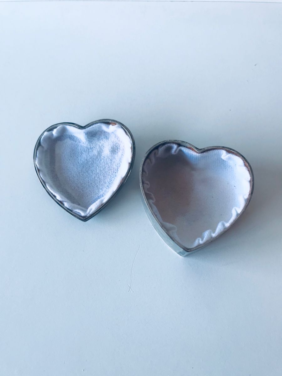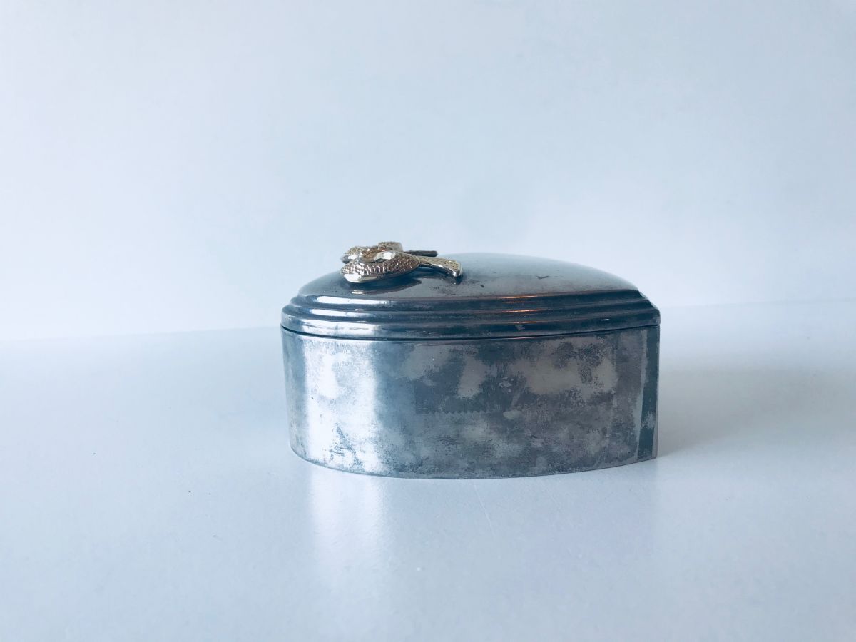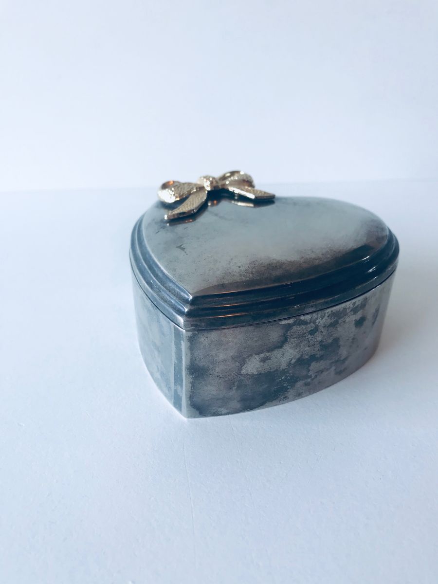 Jolie boîte ancienne en forme de cœur en métal argenté. Le couvercle de cette belle boîte est décoré avec un noeud doré. Là à fois romantique et féminine cette jolie boîte pourra accueillir des petits bijoux.