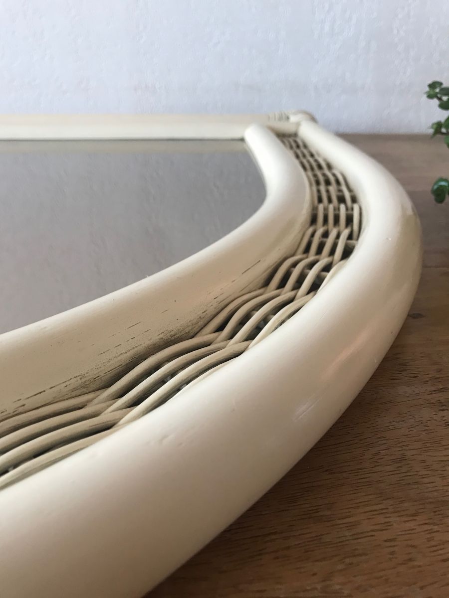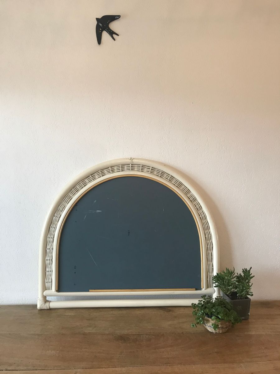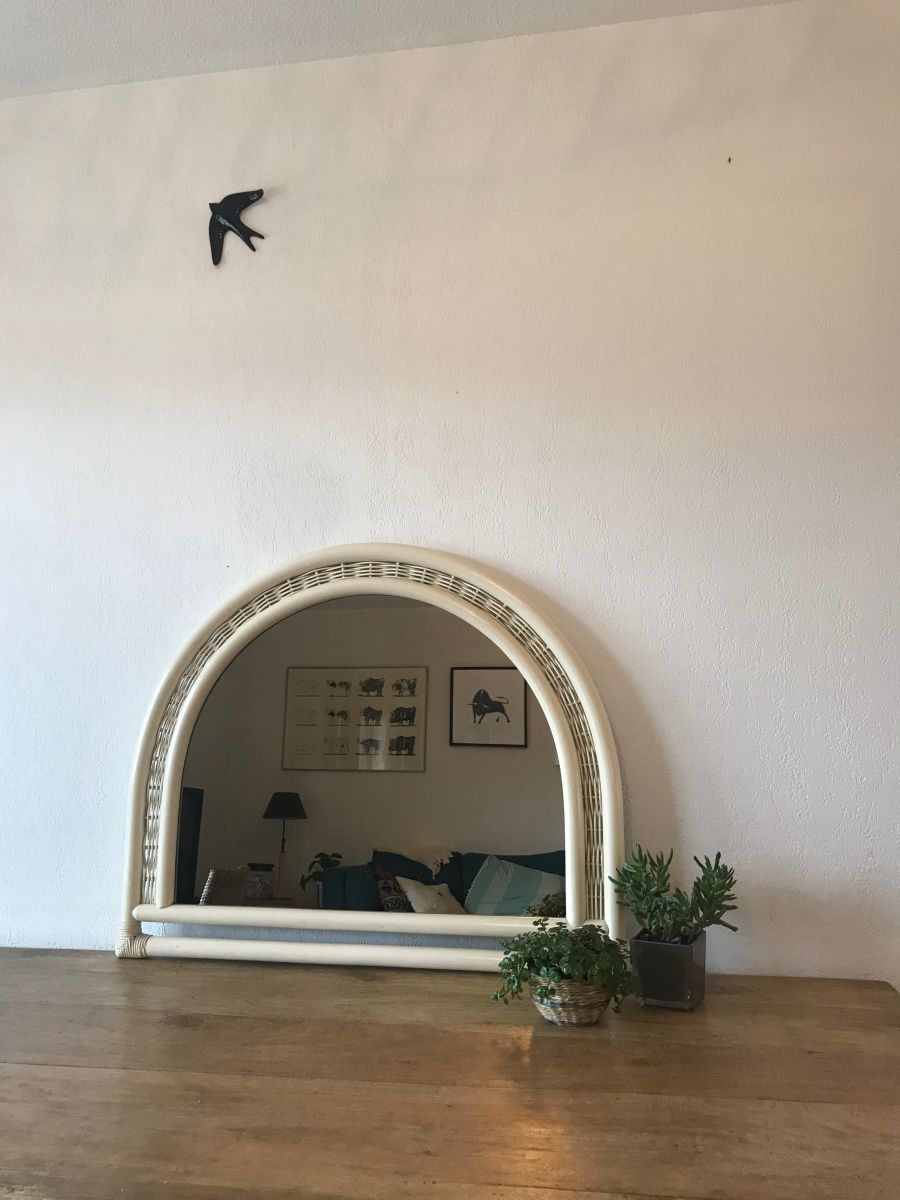 Sublime miroir vintage demi cercle en rotin et osier. Ce joli miroir demi lune rappelle la forme d’une fenêtre, nous évade dans un jardin botanique avec une orangeraie et une douceur particulière. On l’imagine volontiers rejoindre une véranda, une salle de bain ou une entrée au style shabby. Le verre fumé lui rajoute un supplément d’âme.