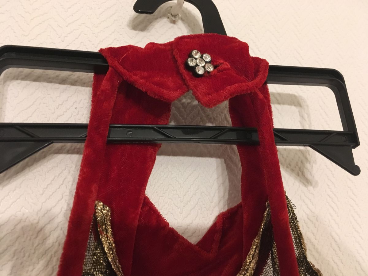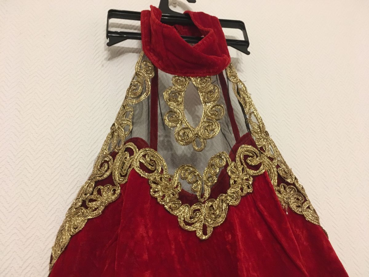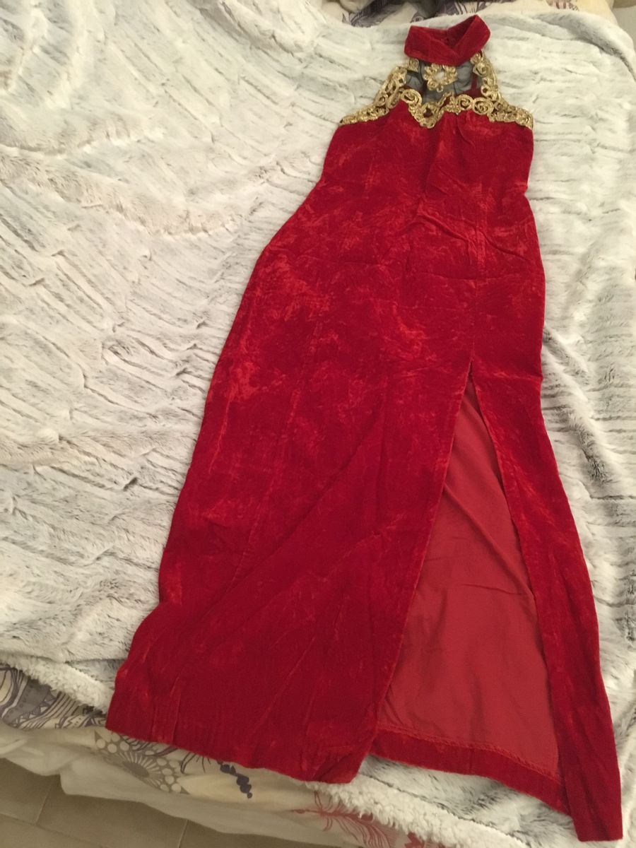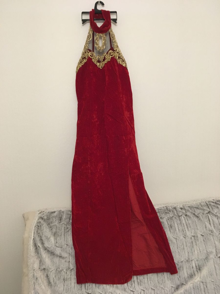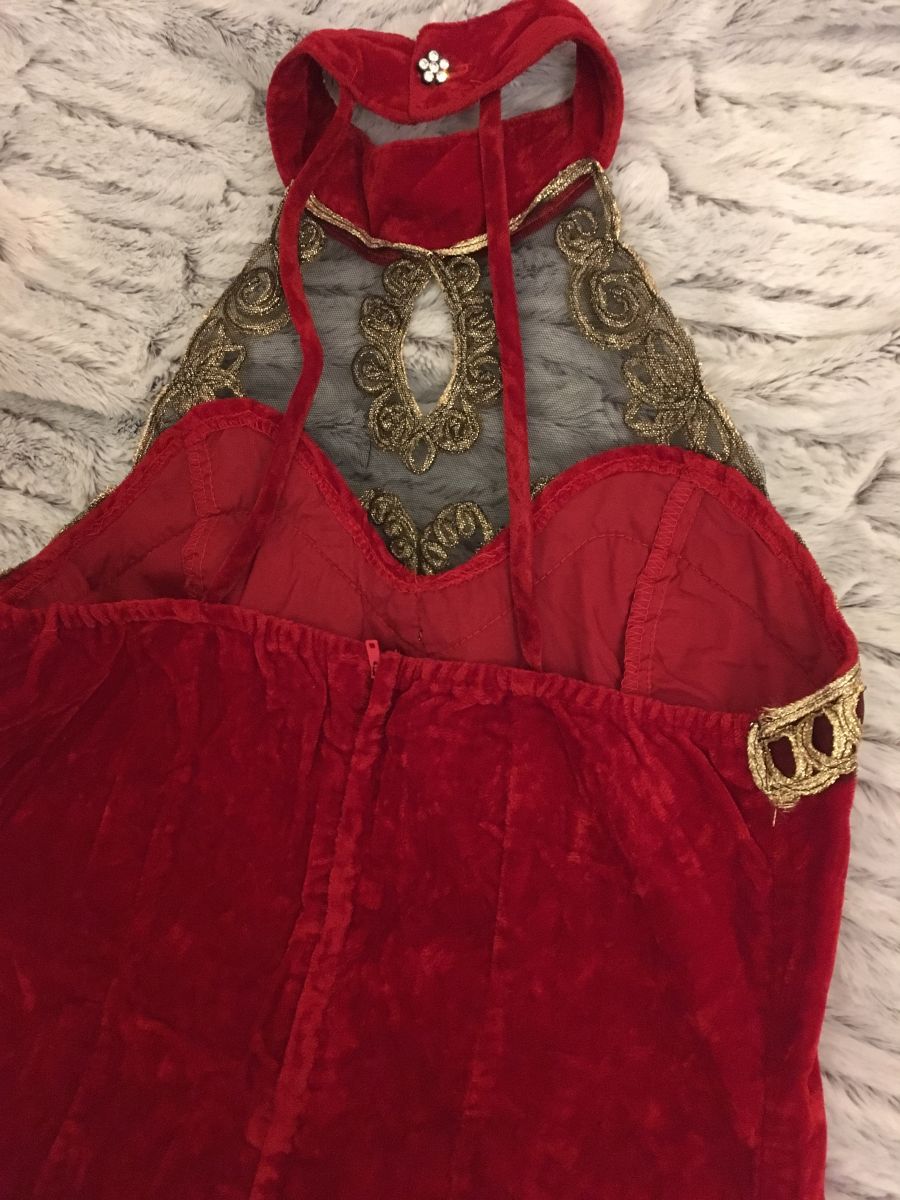 Robe idéale pour les fêtes ou les occasions (en velours rouge, broderie dorée sur le devant du col, deux fines bretelles derrière qui laisse la moitié du dos nu)
