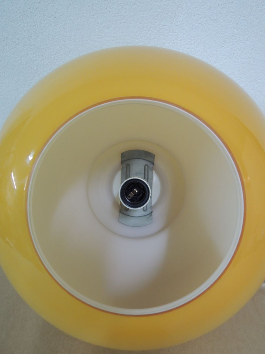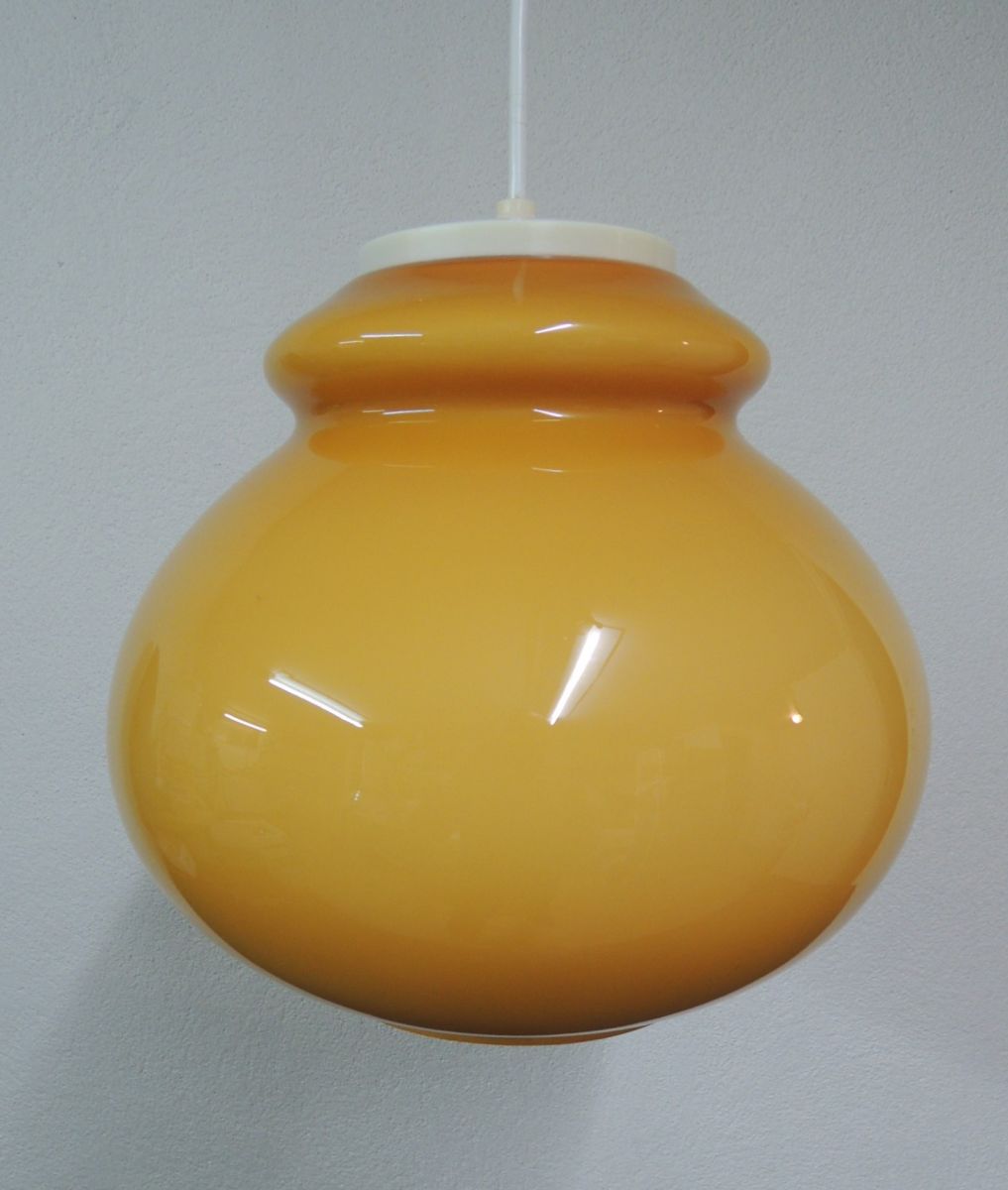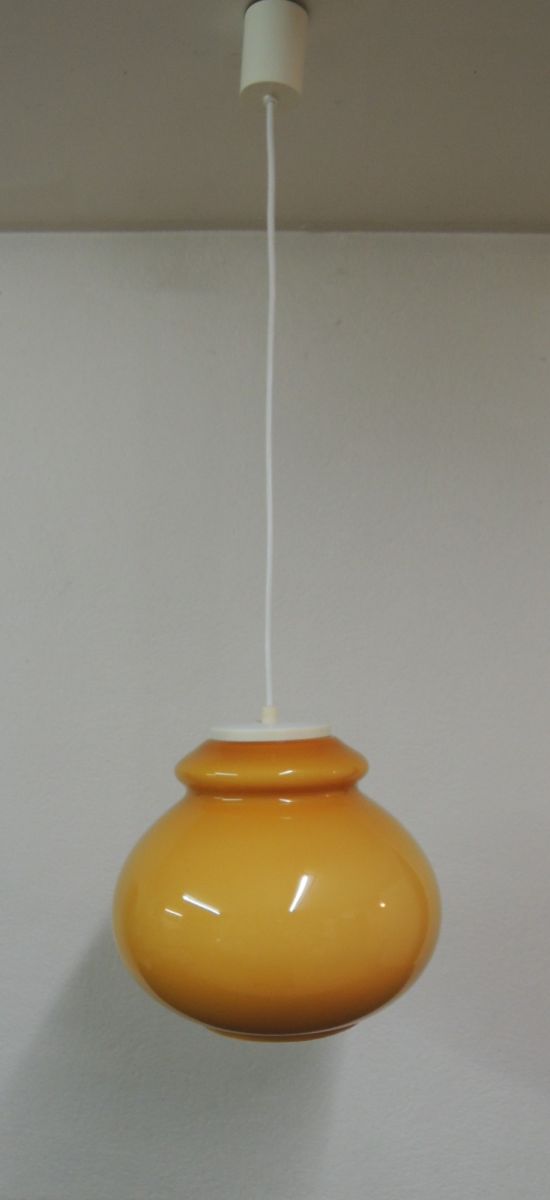 Suspension en verre opaline orange, avec douille à vis de type E27, câble de 60 cm avec accroche et pavillon en PVC blanc. Diamètre du globe 30 cm. Poids 2.5 kg