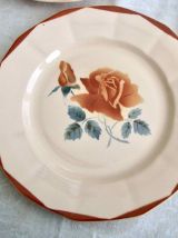 Set de 6 assiettes plates anciennes en faïence de Digoin Sarreguemines en très bon état, les seuls petits défauts sont liés à leur fabrication (quelques très petites gouttes de couleur).