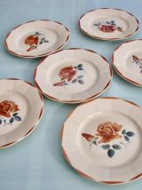 Set de 6 assiettes plates anciennes en faïence de Digoin Sarreguemines en très bon état, les seuls petits défauts sont liés à leur fabrication (quelques très petites gouttes de couleur).