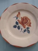 Set de 6 assiettes plates anciennes en faïence de Digoin Sarreguemines en très bon état, les seuls petits défauts sont liés à leur fabrication (quelques très petites gouttes de couleur).