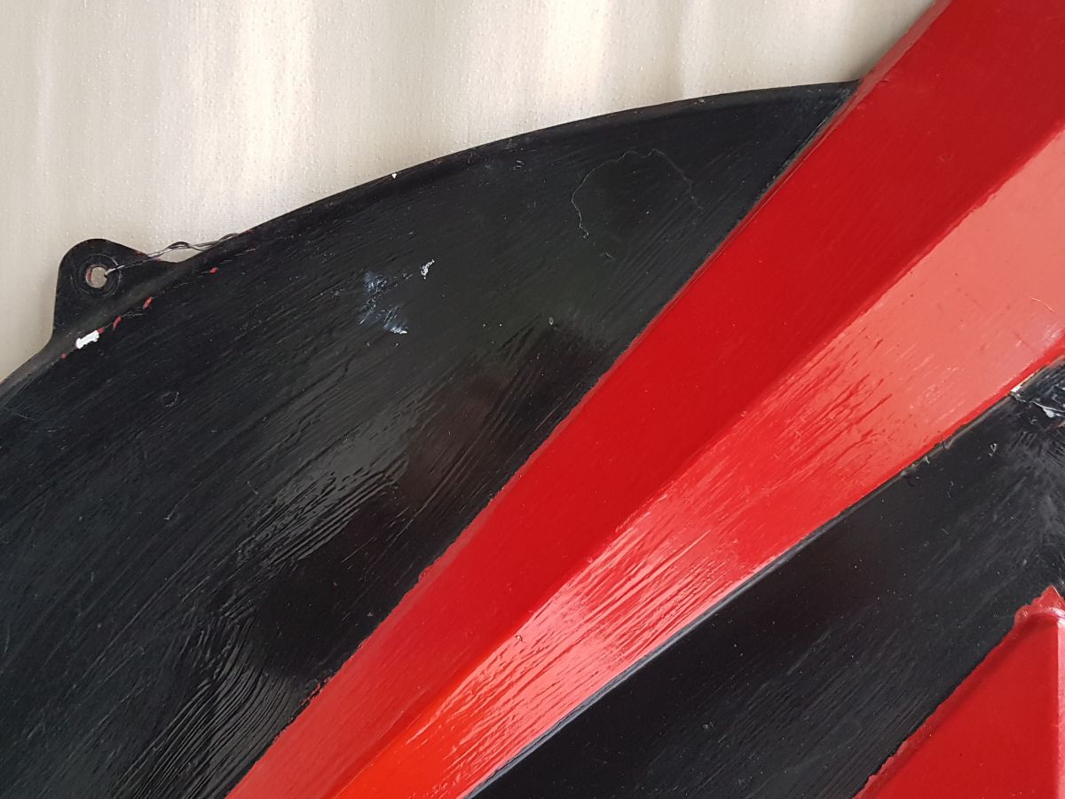 La plaque a été repeinte en noir et rouge, on aperçoit des traces de peinture ancienne à certains endroits, le fond était émaillé blanc et les chevrons de couleur jaune