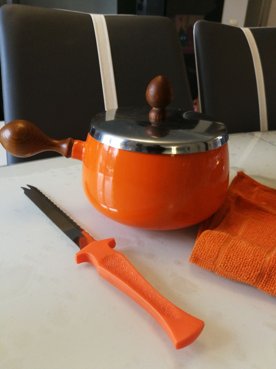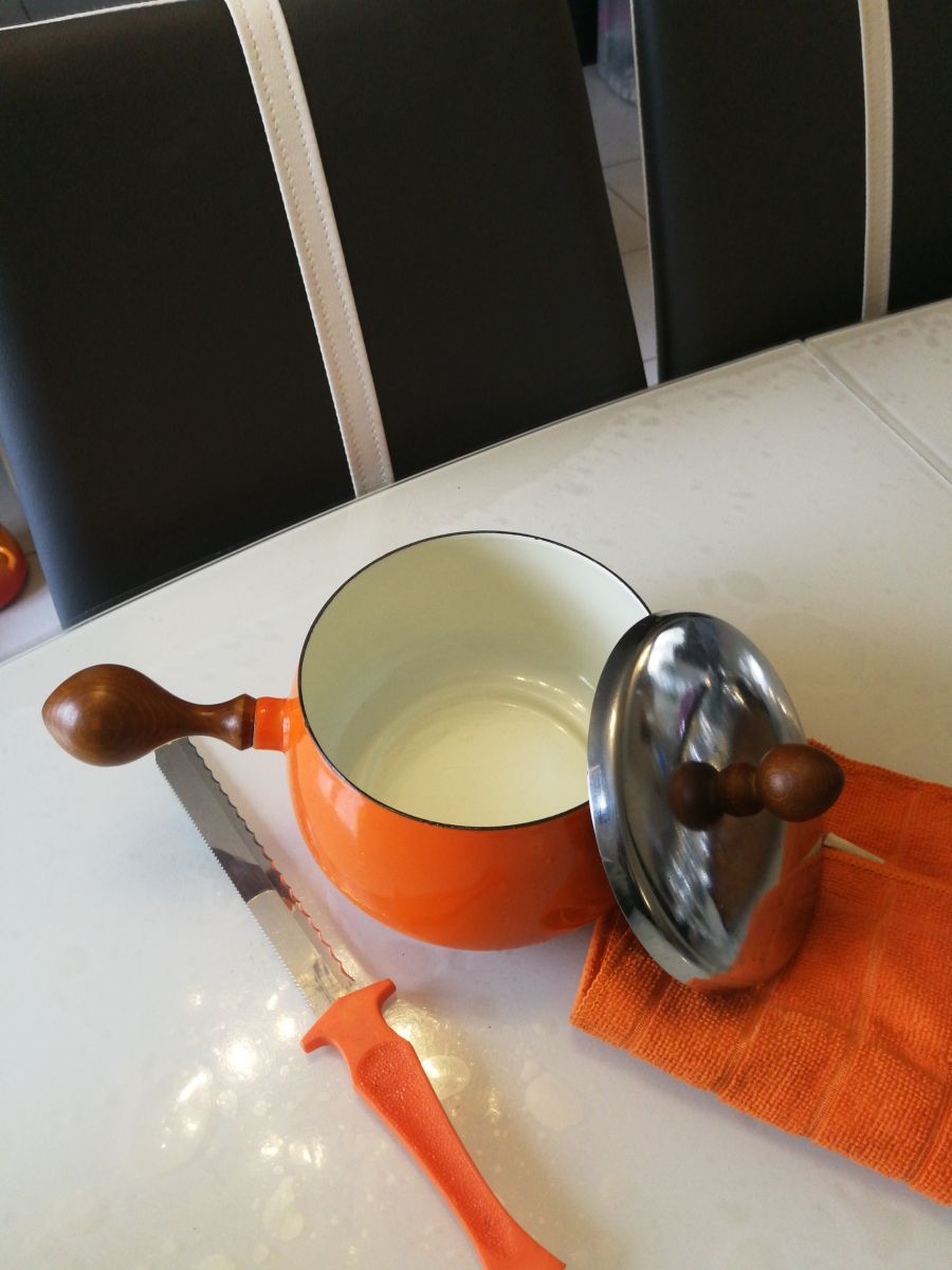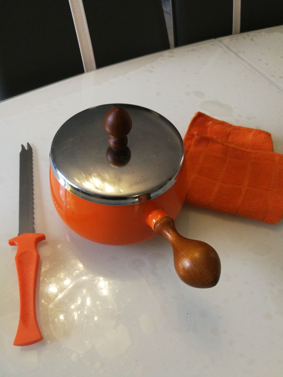 Poêlon avec sa lance en bois et son couvercle en aluminium, bois très agréable pour les nostalgiques des années 70.