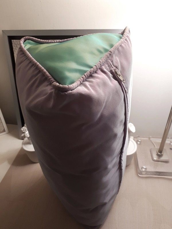 Magnifique coussin bicolore de forme triangulaire vintage. Couleurs douces et quelques peu holographiques. S'intègre parfaitement dans une chambre ou dans salon. Son petit plus, sa housse déhoussable.