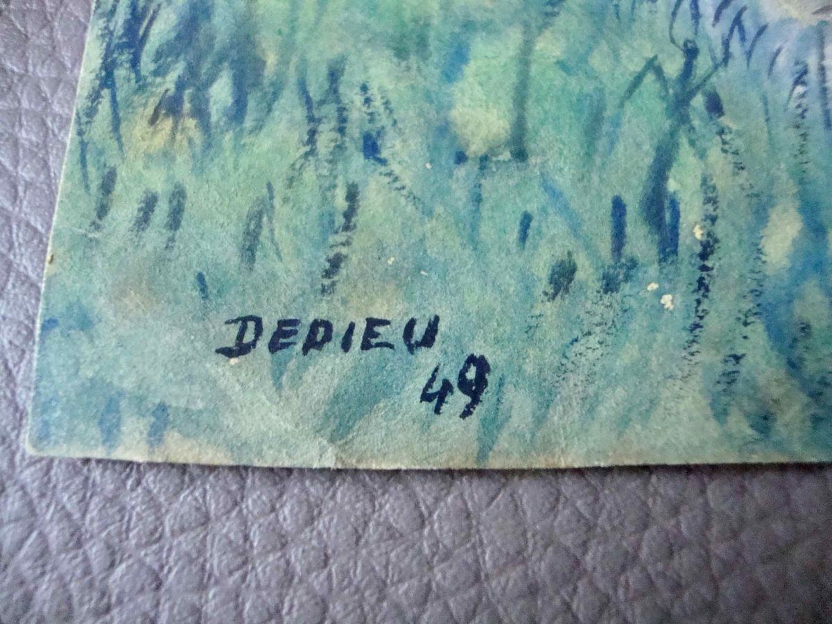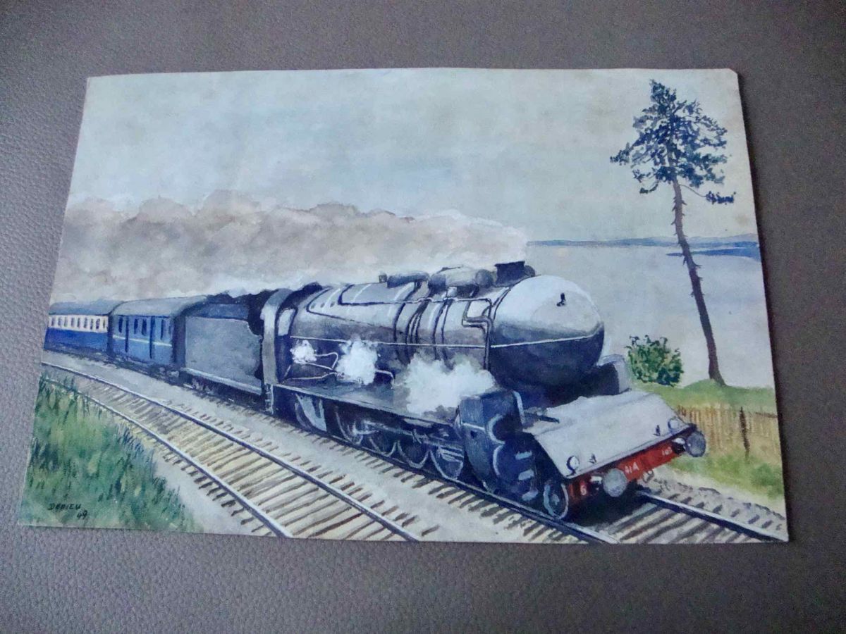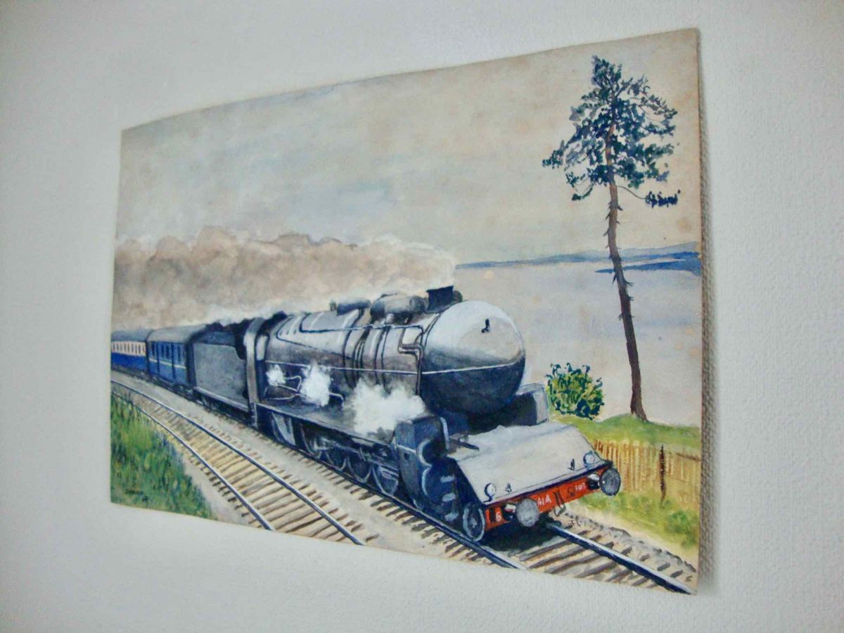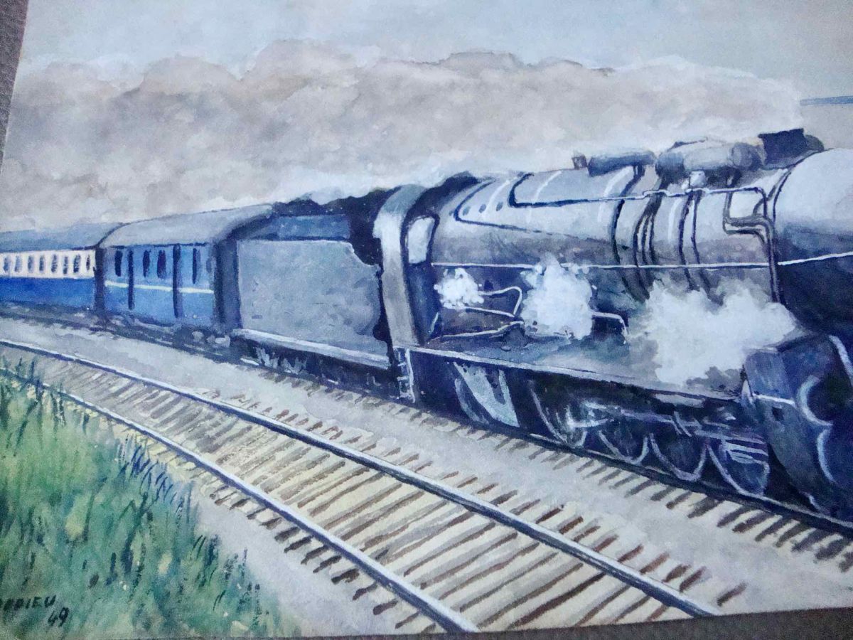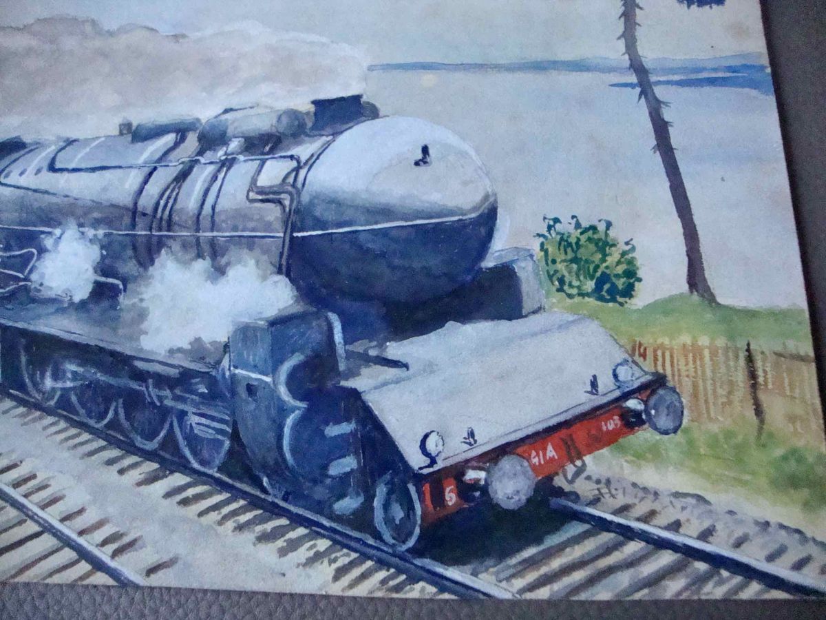 Tableau locomotive à vapeur, signé « Dedieu 1949 ». Aquarelle.