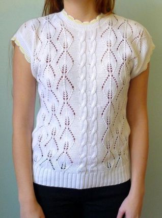 Vintage des années 90, pull à torsades et maille troutrou en coton acrylique blanc. Manches courtes, encolure et manches à bord finition croquet bordé d'une rayure jaune. Sans marque (made in France), excellent état.