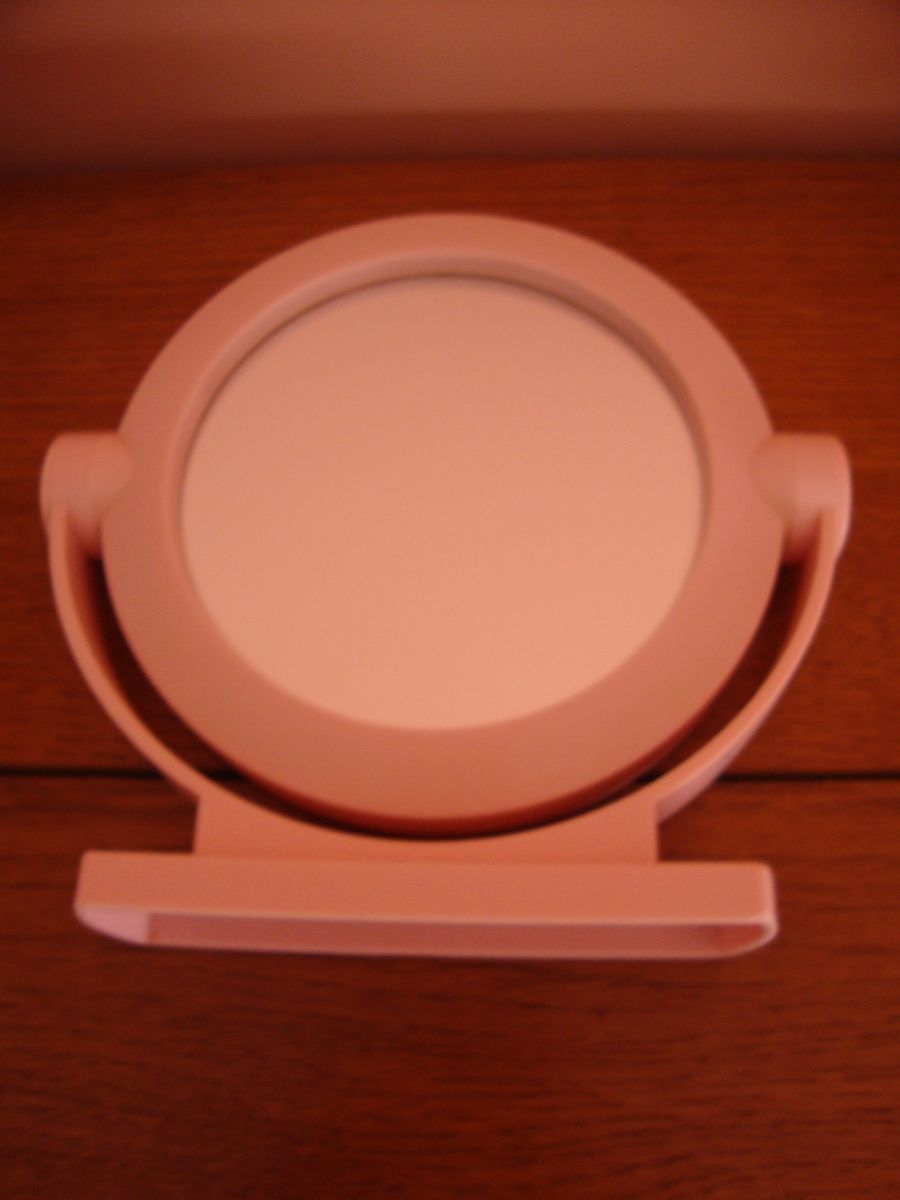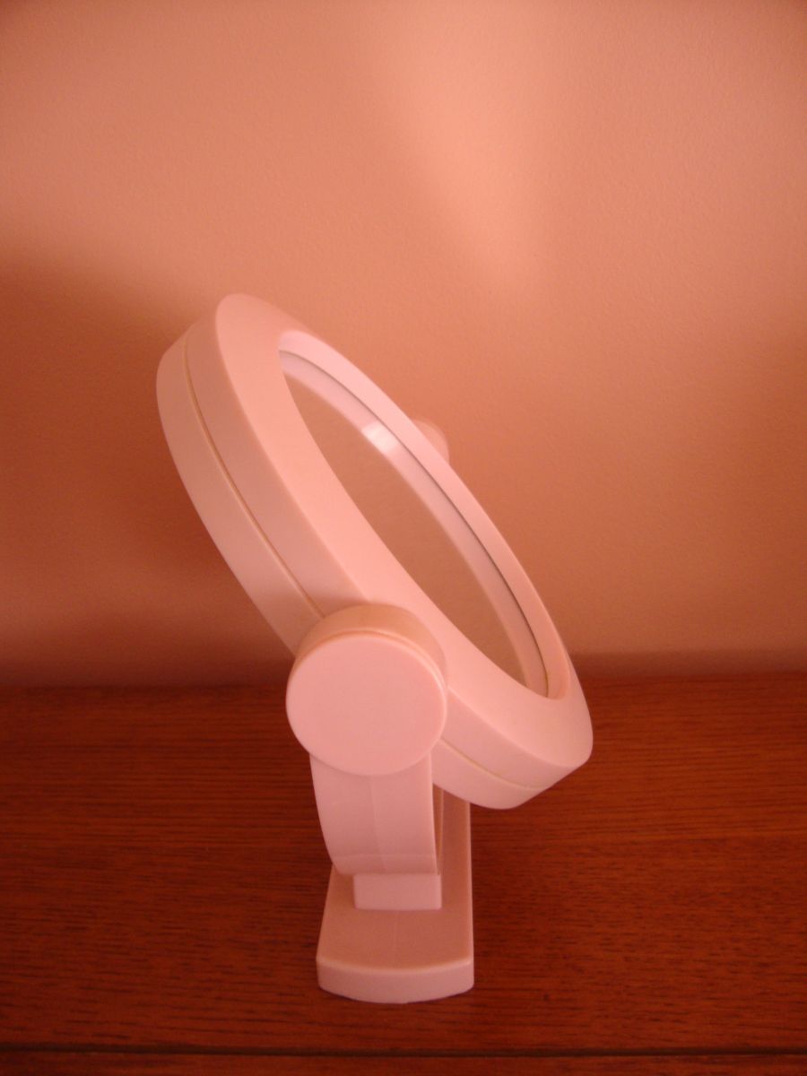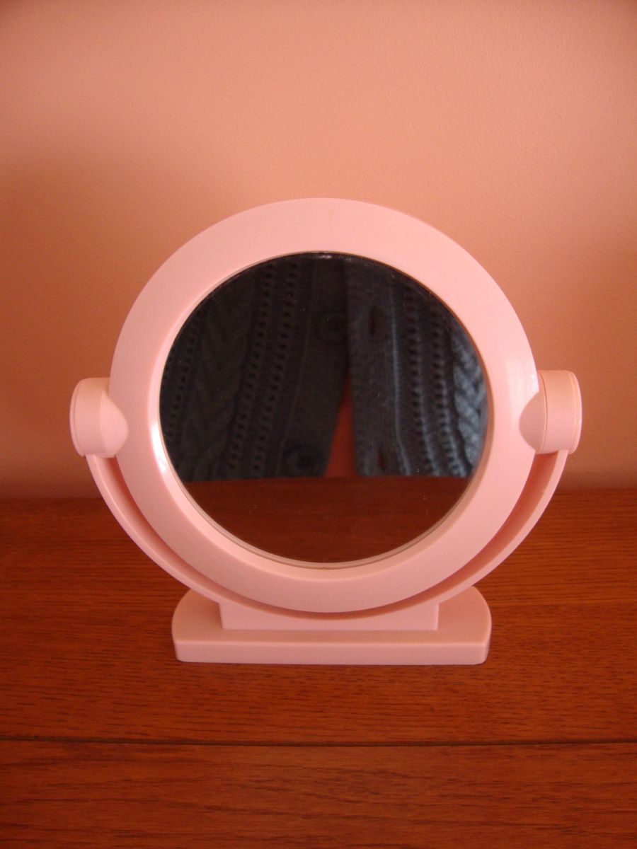 Miroir pivotant vintage double face (dont l'une grossissante) entourage et pied plastique rose pastel.