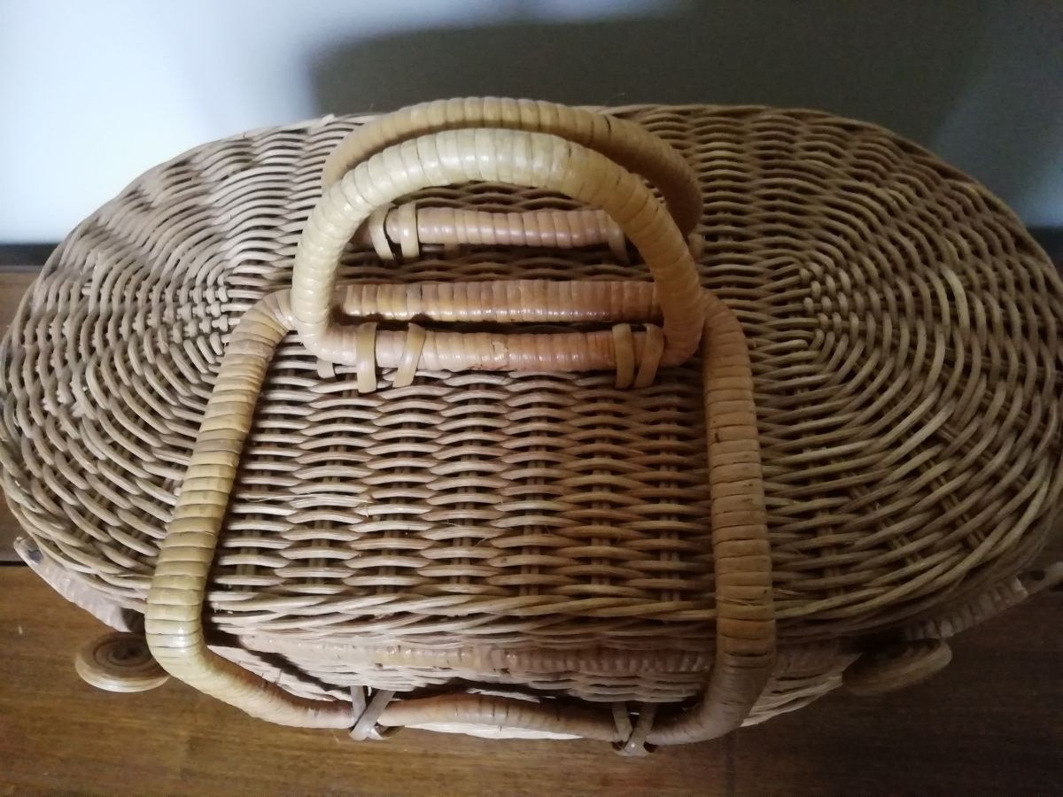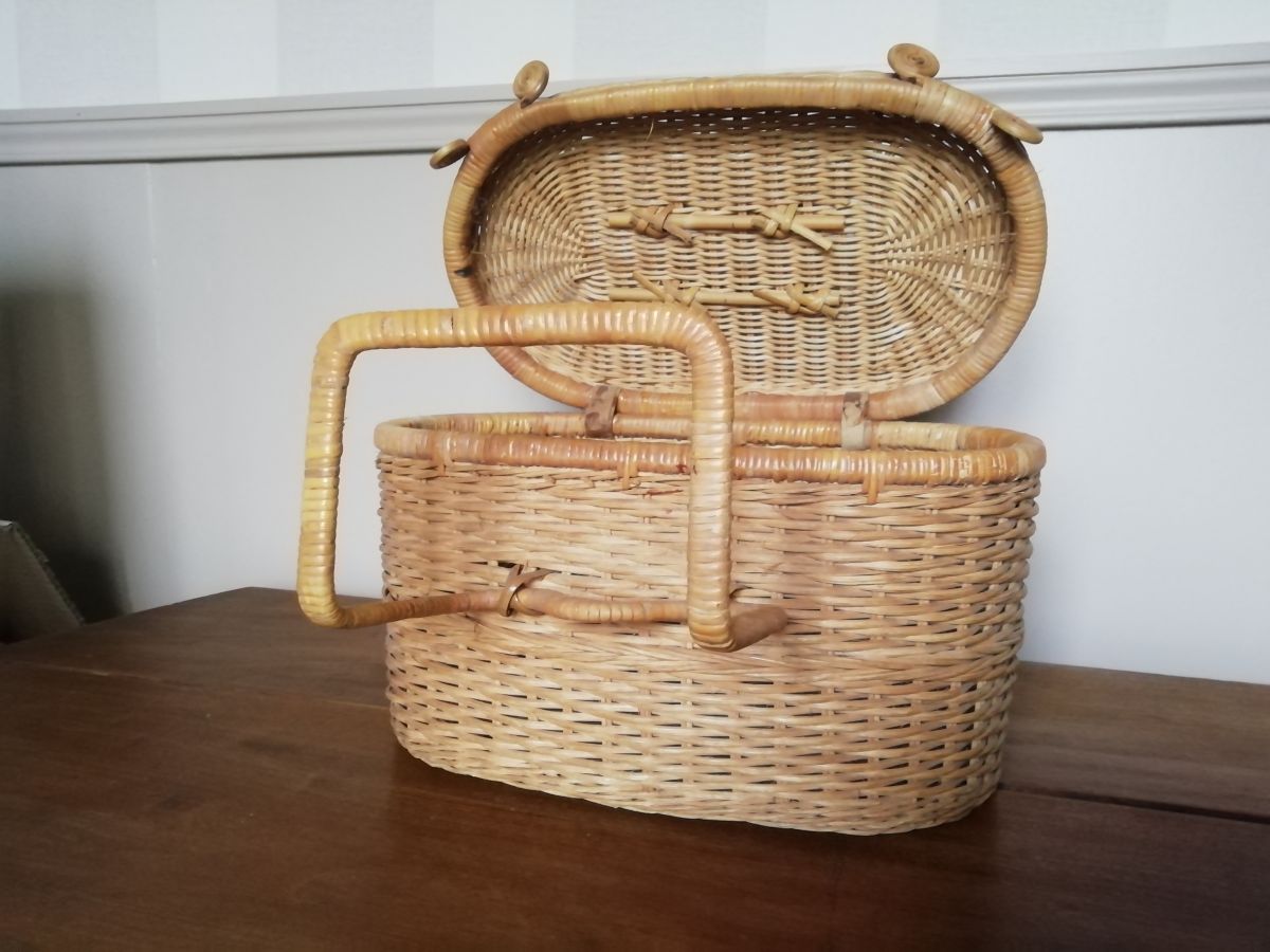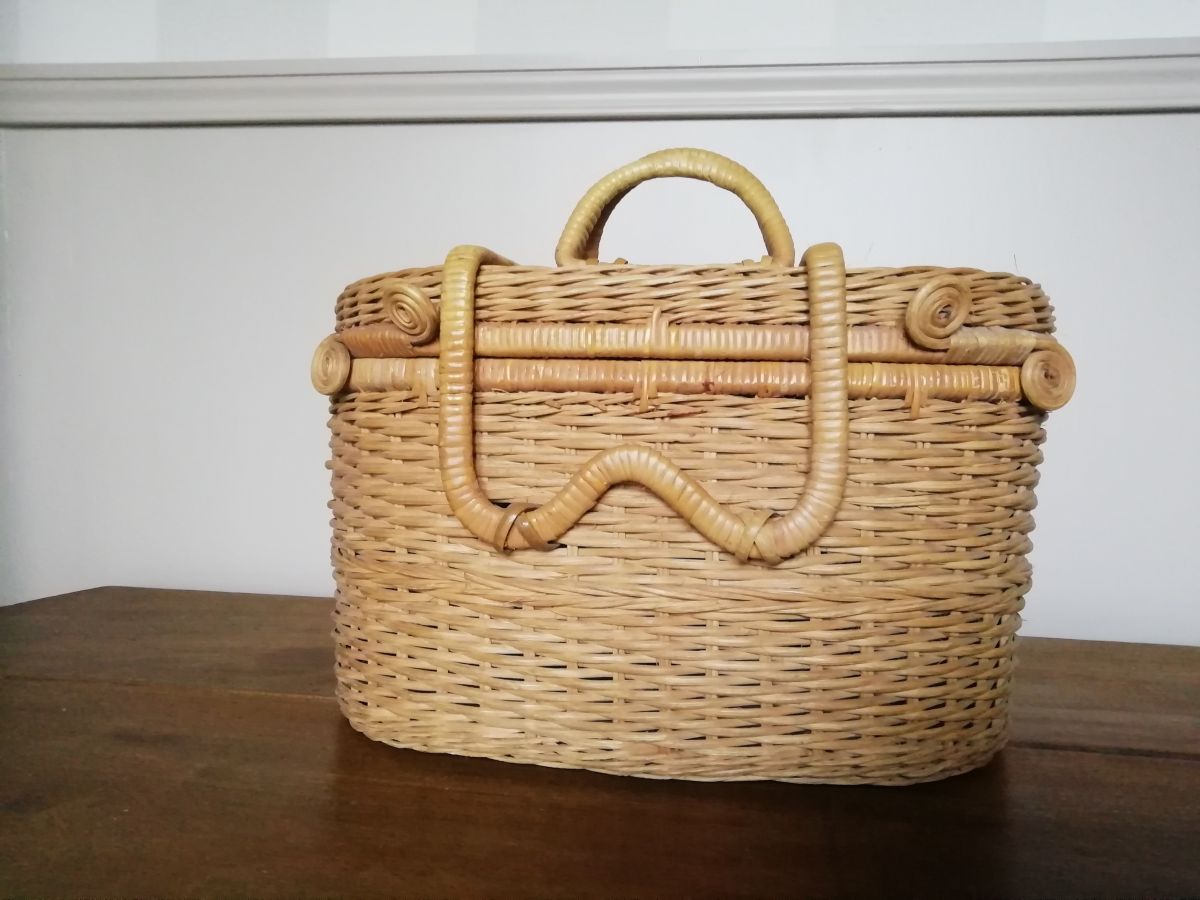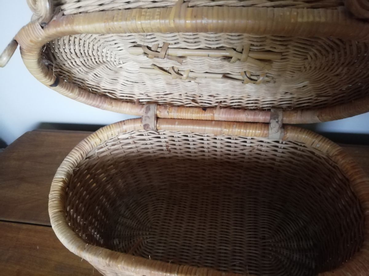 Panier en osier en bon état .De couleur claire et orné de jolies volutes.Charnières en cuir un peu usées , manque de verni sur poignées. Sera très joli dans une chambre d'enfants pour ranger ses doudous.