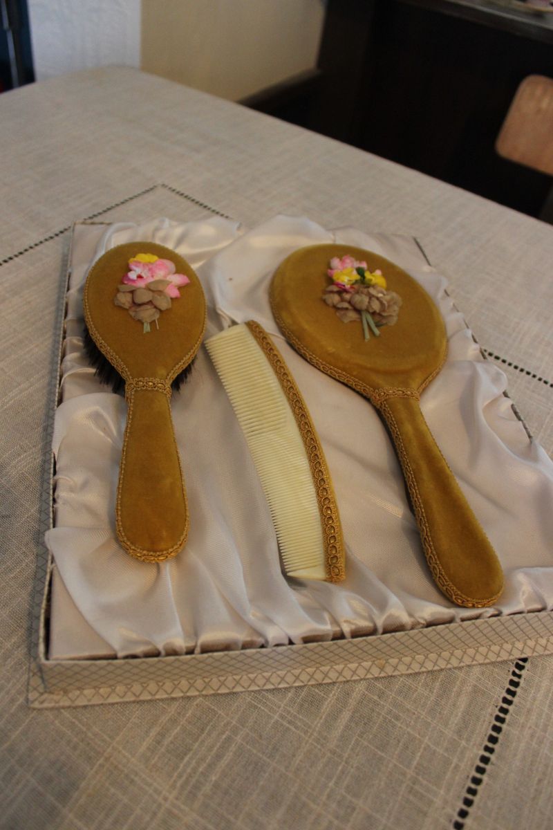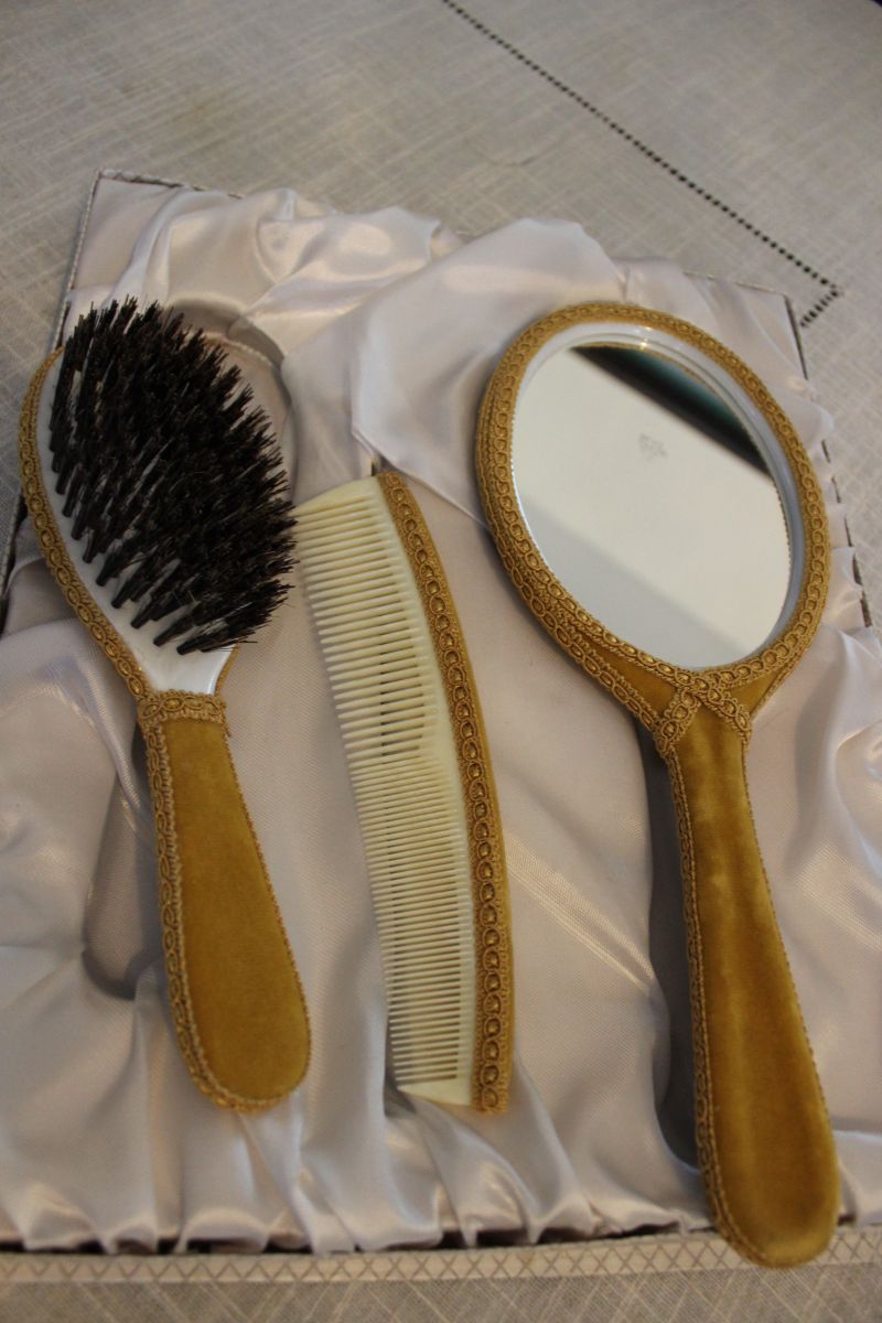 Ensemble coiffure miroir à main avec sa brosse et son peigne.