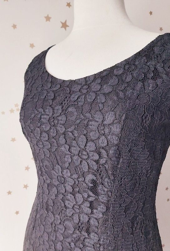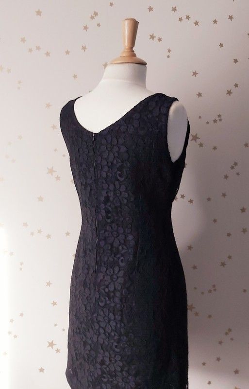 Vintage des années 1960 robe sans manches et près du corps en dentelle de coton noire (tirant sur le marine), encolure ronde devant et dos, zip metallique dos, doublure noire. Fait main en France, très bon état.