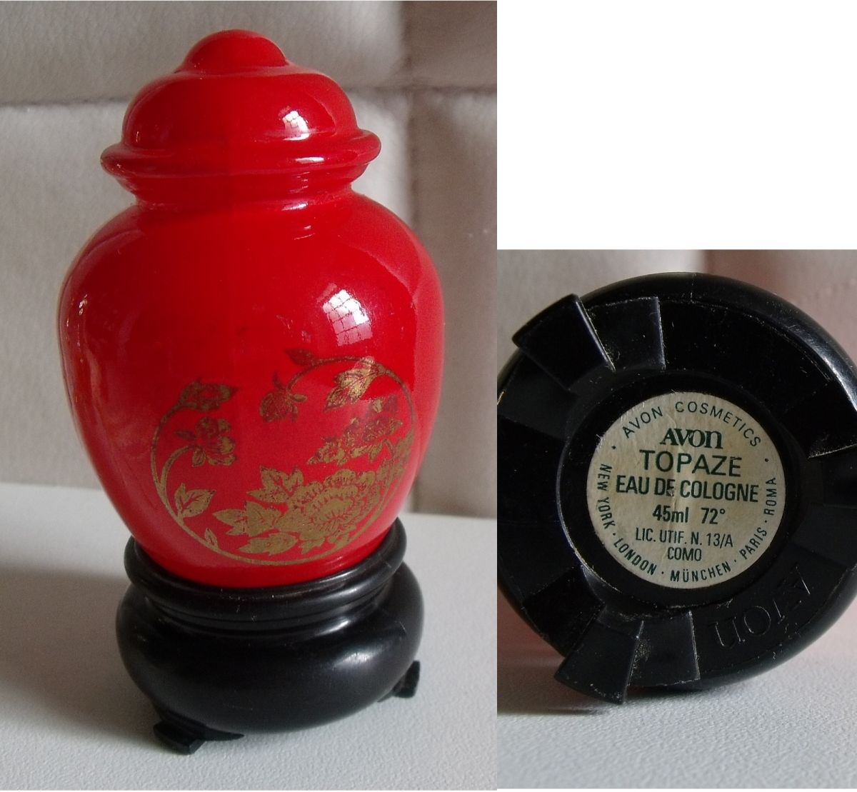 - 1 flacon (vide) forme vase chinois à couvercle en verre rouge décor doré sur socle noir AVON contenait EDC - 45 ml - 9,5 cm de hauteur - Excellent Etat