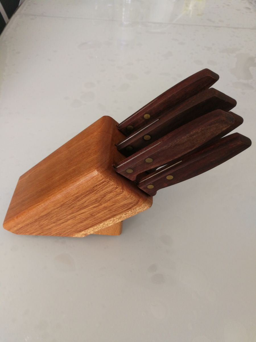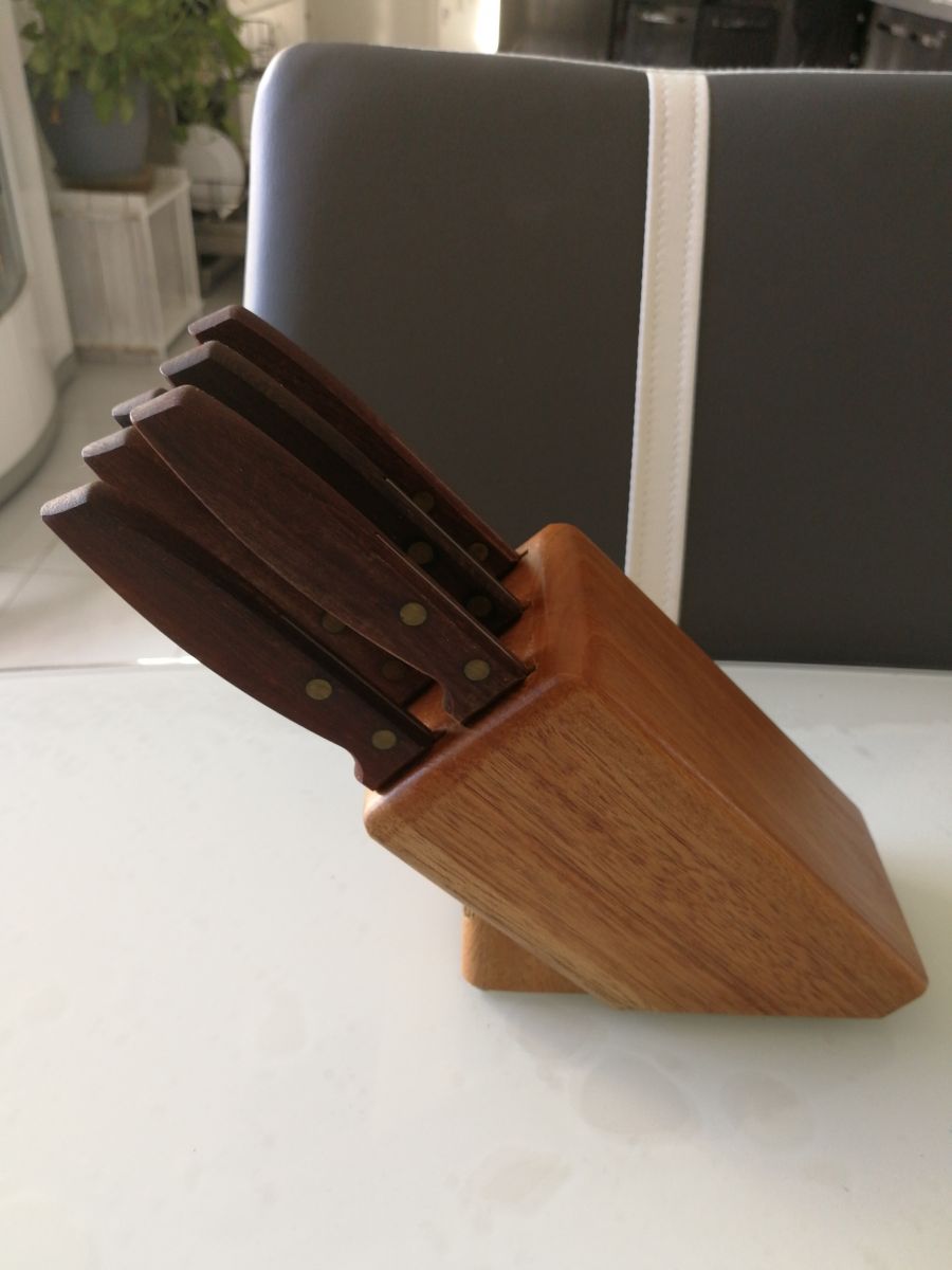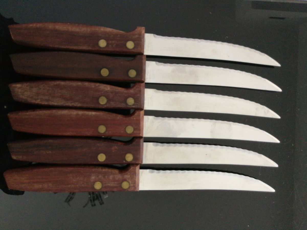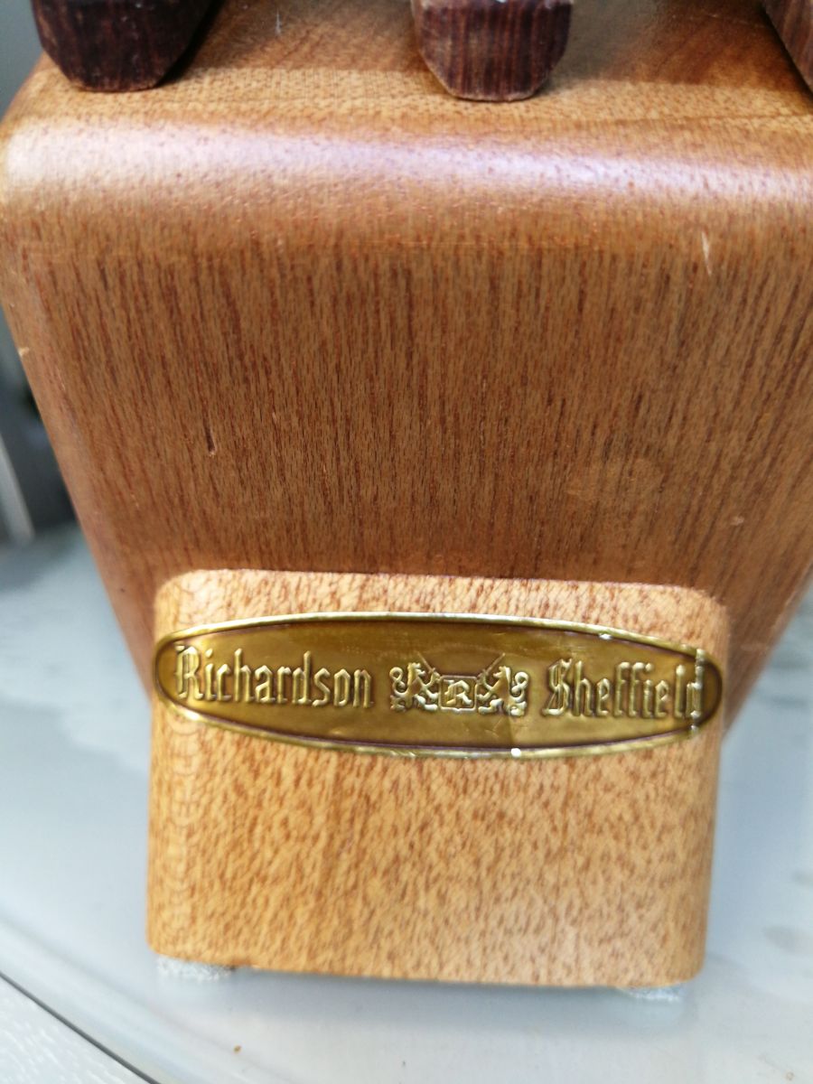 6 Couteaux à viande Richardson Sheffield Vintage de bonne qualité, dans leur porte couteaux en bois. C'est d'occasion donc pas neuf.