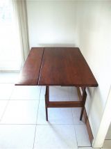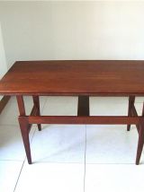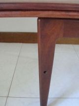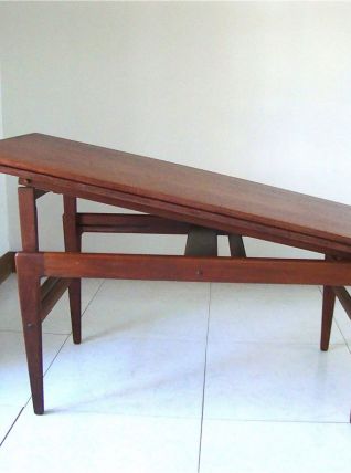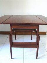 Il s’agit du fameux modèle modulable danois de table basse en teck, crée par Kai Kristiansen au Danemark dans les années 60. Sobre et élégante, elle peut devenir tour à tour grande ou petite, table de salle à manger, table basse ou bureau. Elle est en bon état et sans taches mais comporte quelques traces d’usage dues à son âge et un cache de cheville manquant sur un pied (photo). Elle se soulève et se baisse facilement d’un coté puis de l’autre, suivant un mode d’emploi très simple.