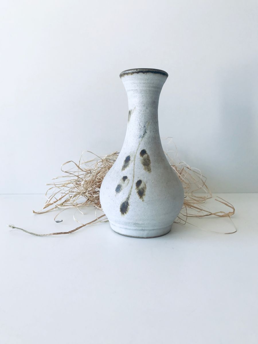 Joli vase ancien en grès avec émaillage blanc chamotté et un décor végétal minimaliste. Ce très joli vase vous séduira par sa simplicité et son style rétro qui pourtant entrera très facilement dans de nombreux intérieurs, il parait presque intemporel. Signature au dos à identifier.