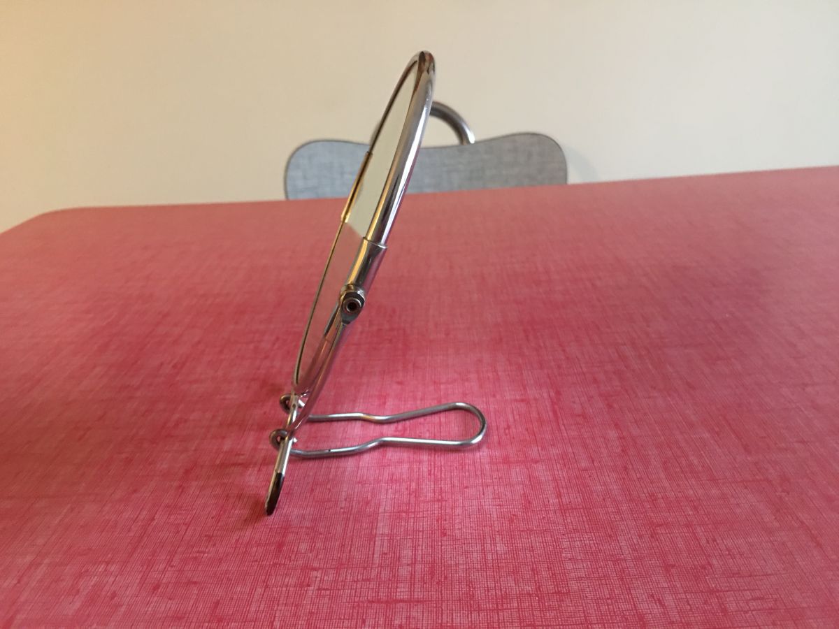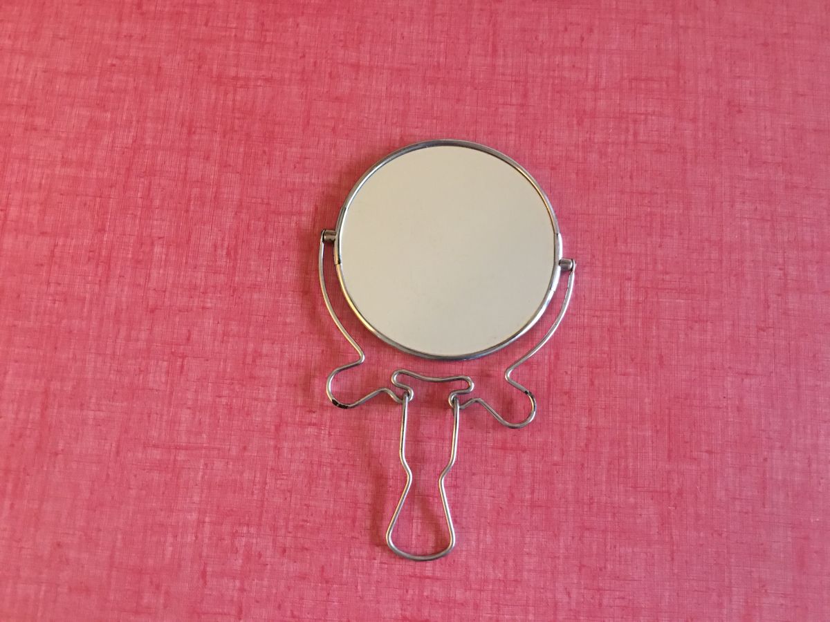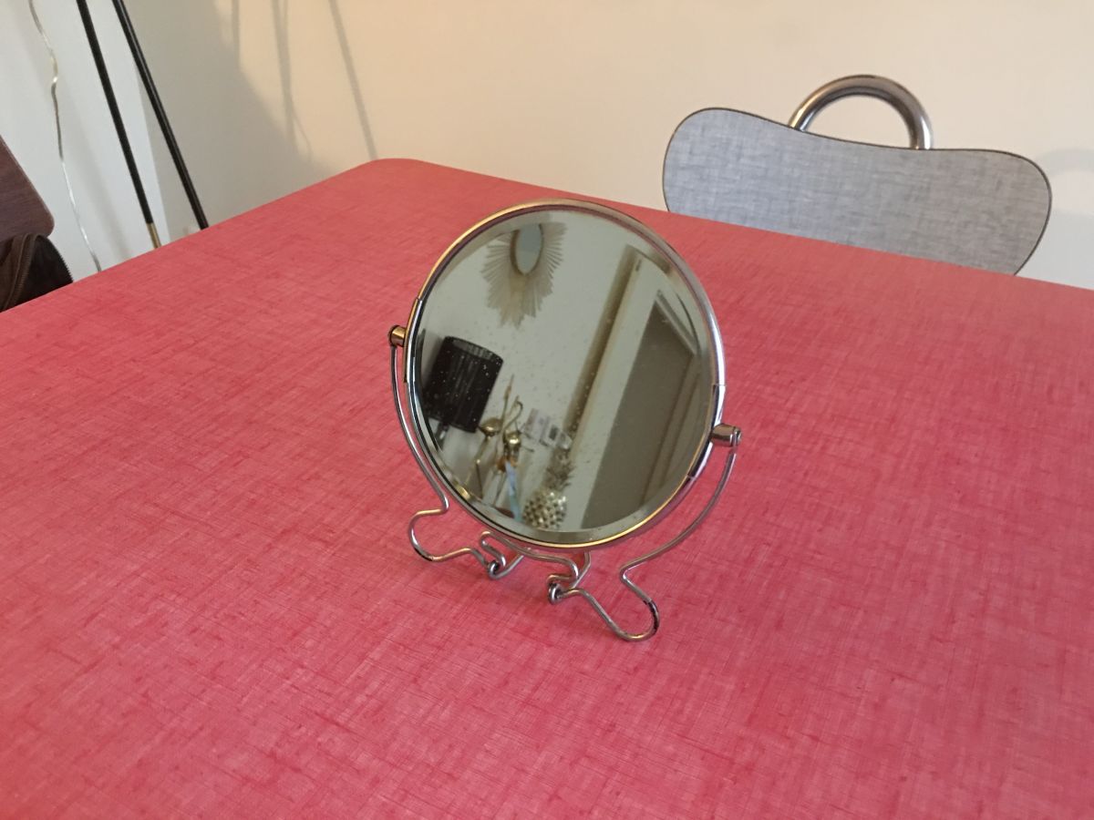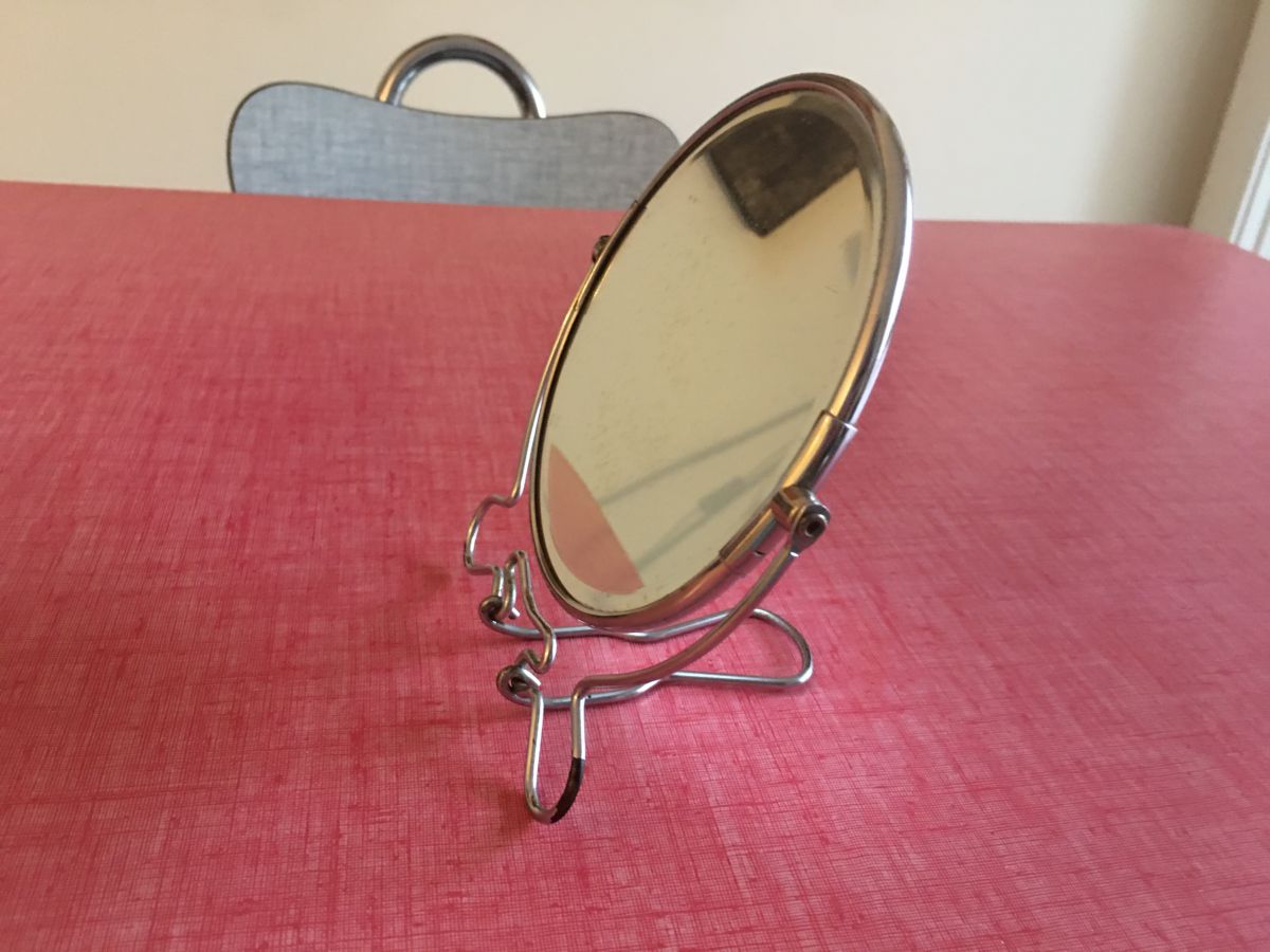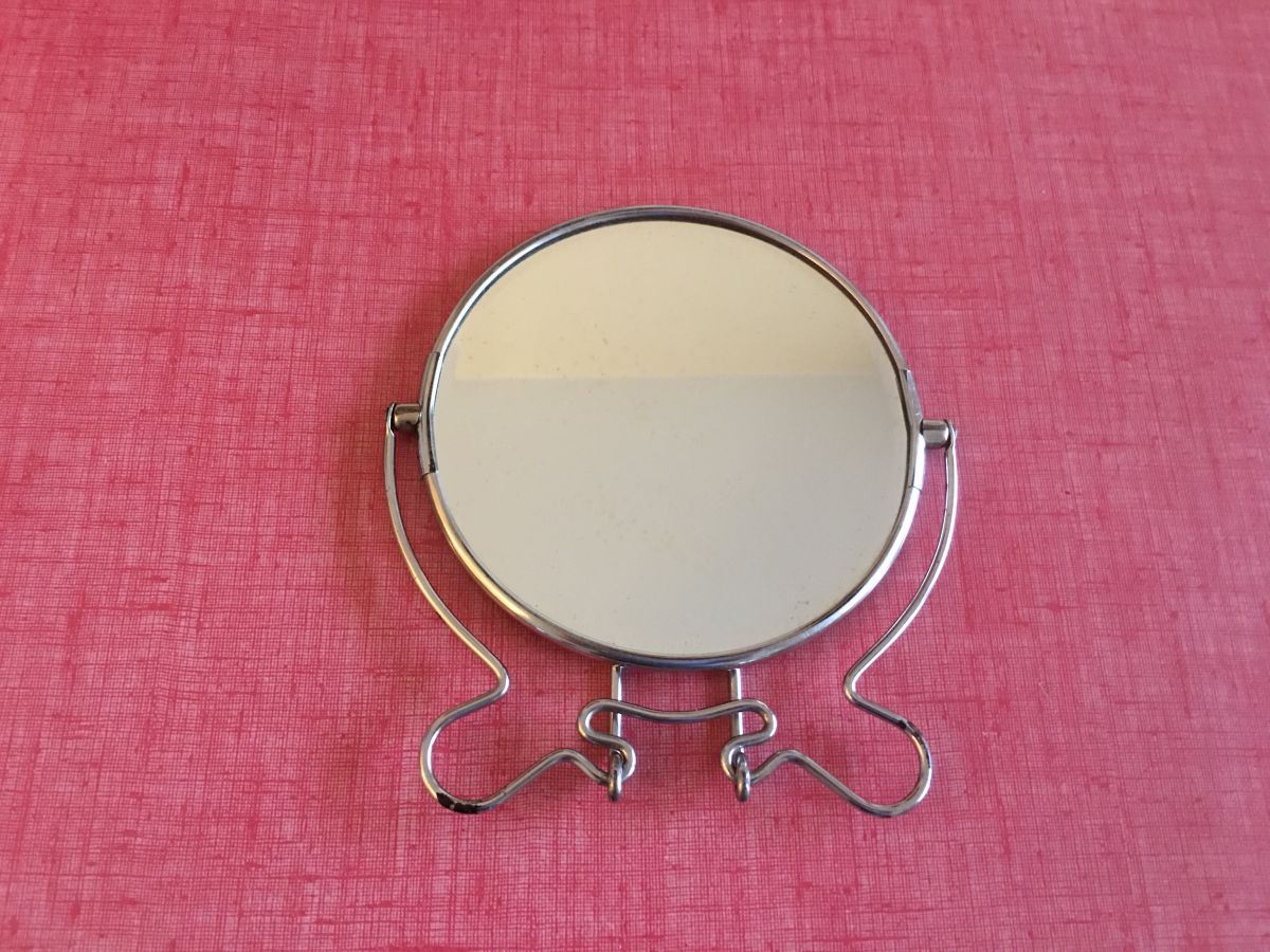 Petit miroir de coiffeur des années 50, monture en métal, quelques piqûres sur la glace qui lui confèrent tout son charme,diamètre glace 12cm, hauteur posé 14cm.