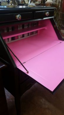 Forme aileron et angles hauts arrondis typique année 50-60, pour ce secrétaire pratique et peu encombrant.Fond refait en noir mat .