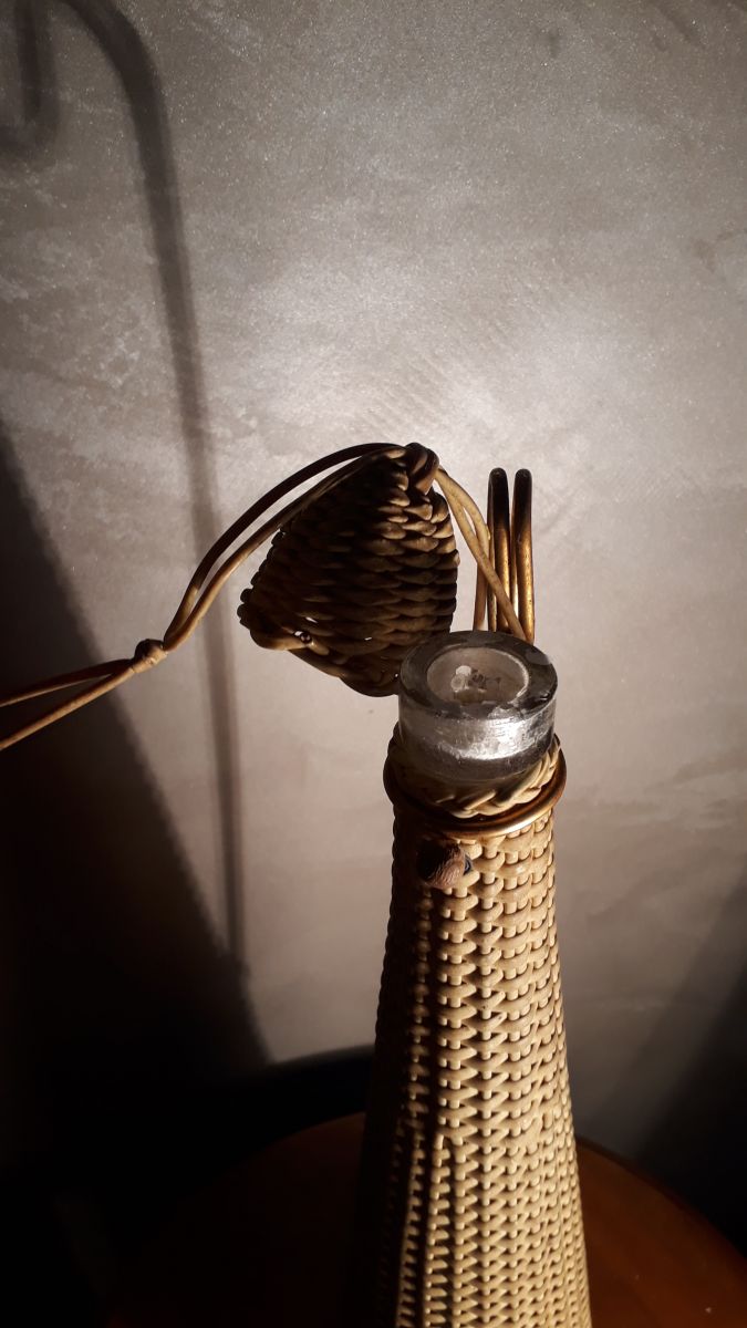 Bouteille scoubidou couleur creme carafe 1970. avec dorure 39x9.