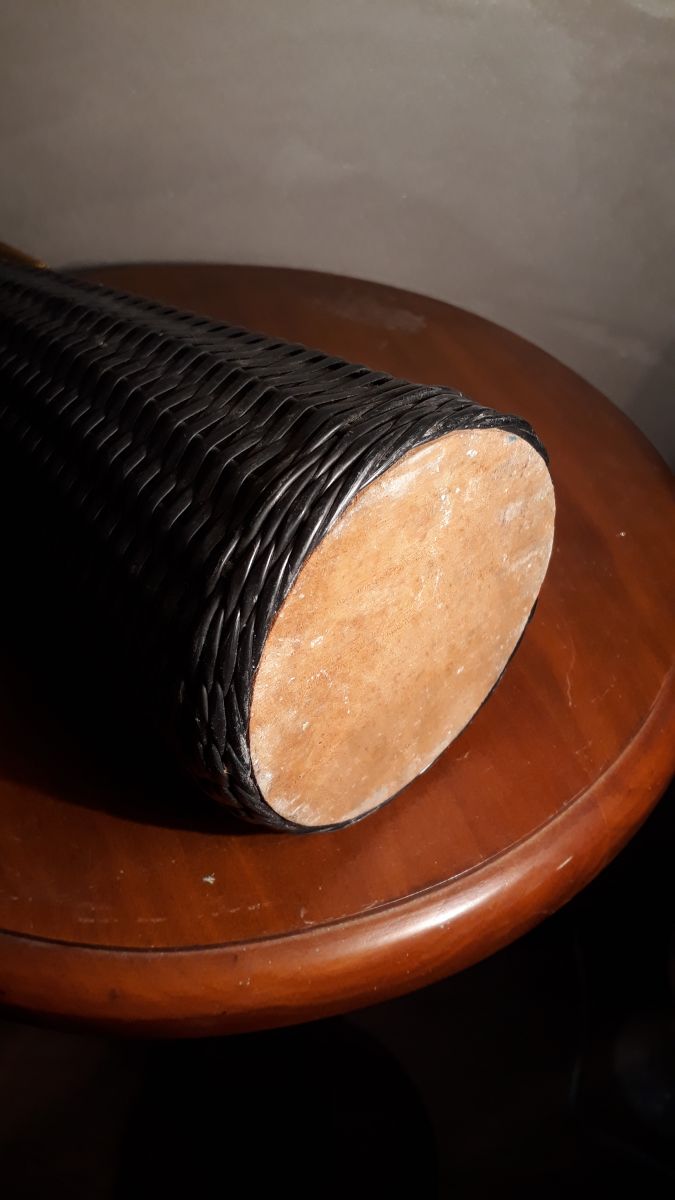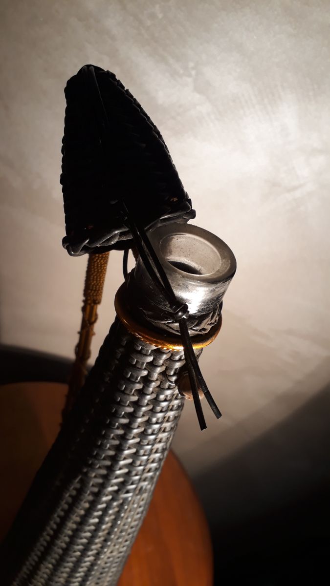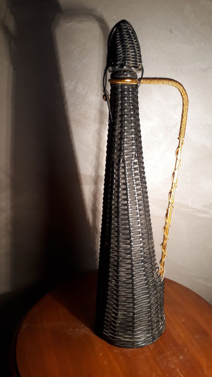 Bouteille scoubidou noir carafe 1970. avec dorure 39x9.Bouteille scoubidou noir carafe 1970. avec dorure 39x9.