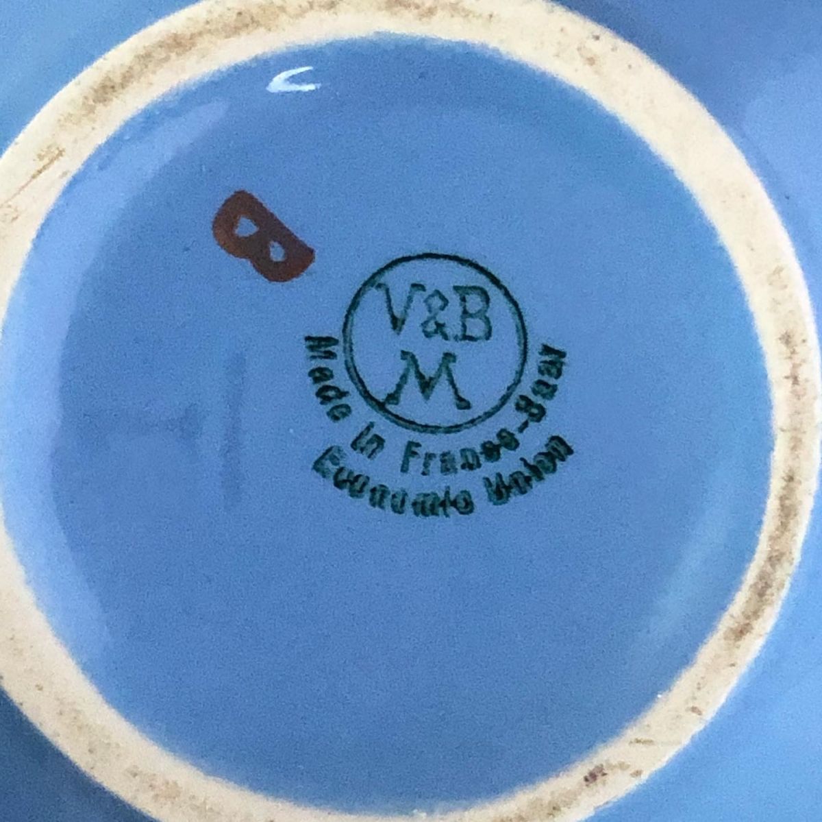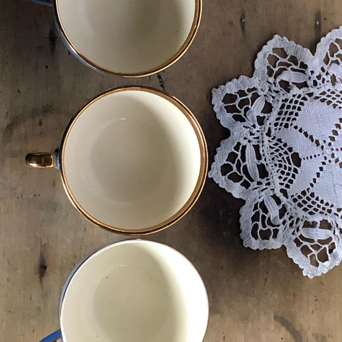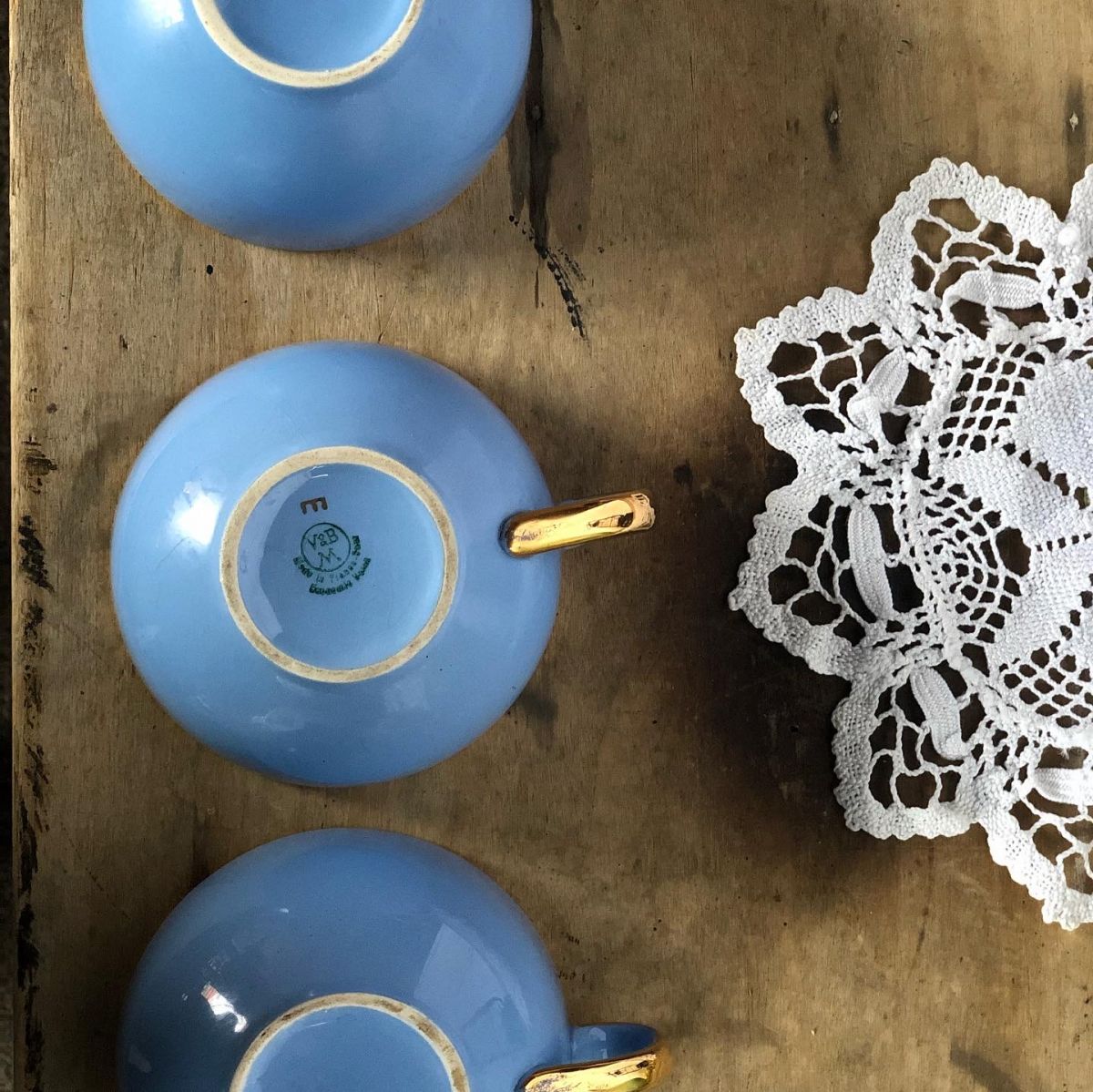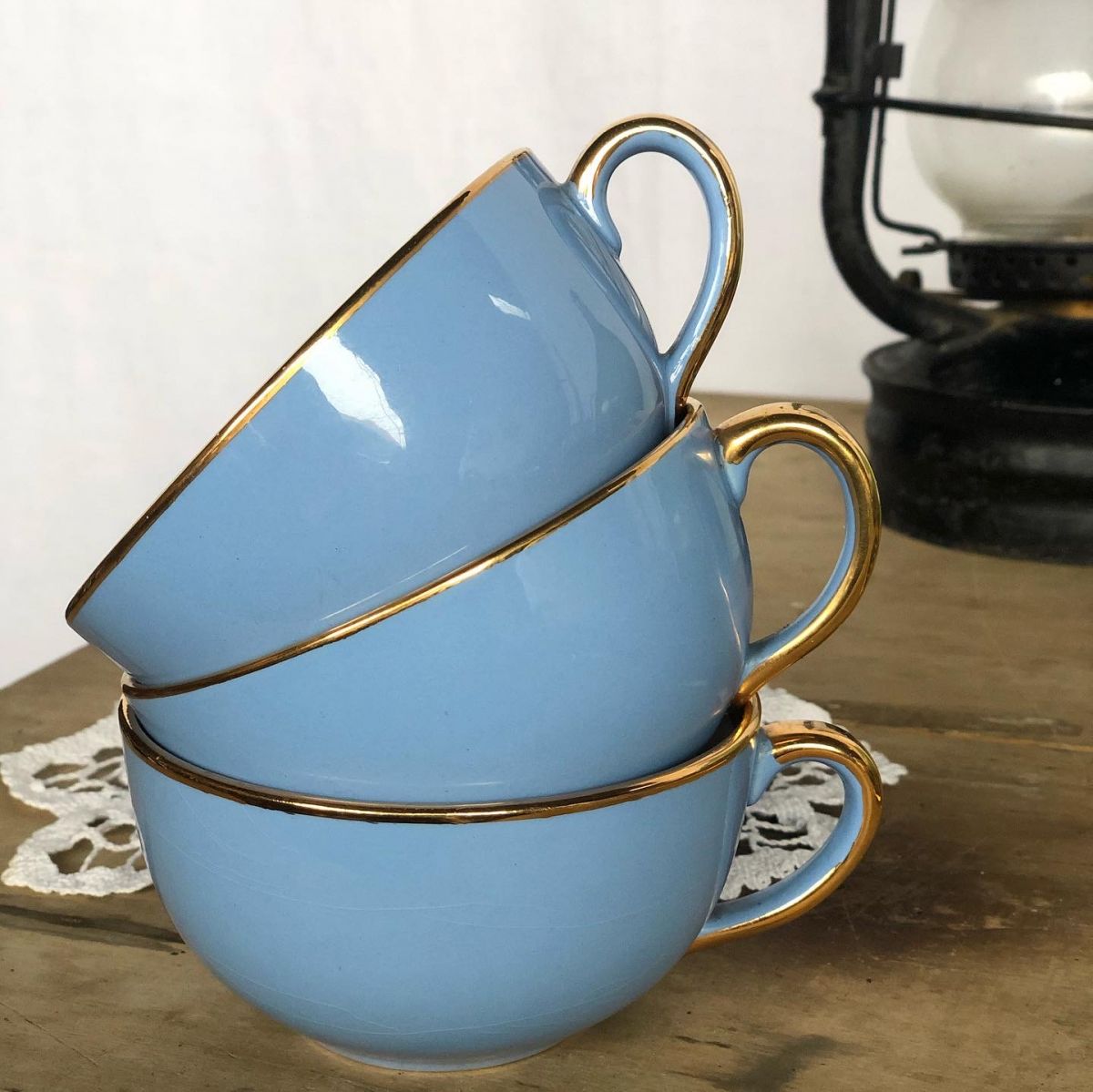 Trio de tasses Villeroy et Boch modèle Orléans, d’un beau bleu ciel de Provence et touche dorée, pour y déguster son thé ou son chocolat en toute élégance.