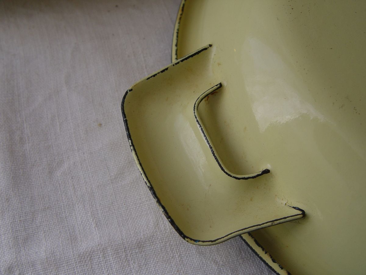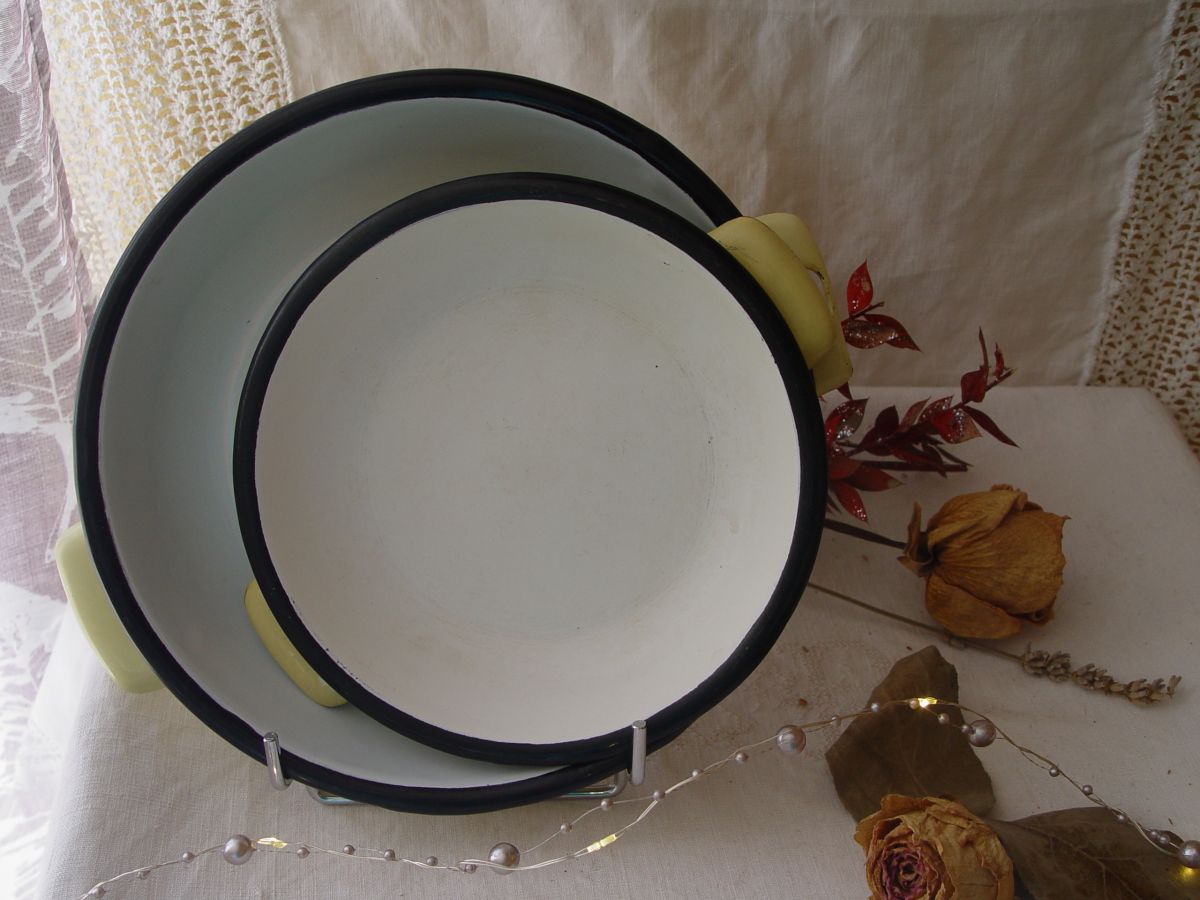 Voici un lot de 2 plats en fer émaillé vintage de couleur jaune à bordure noire en très bon état.