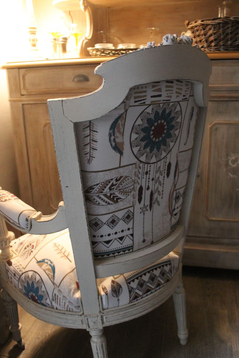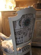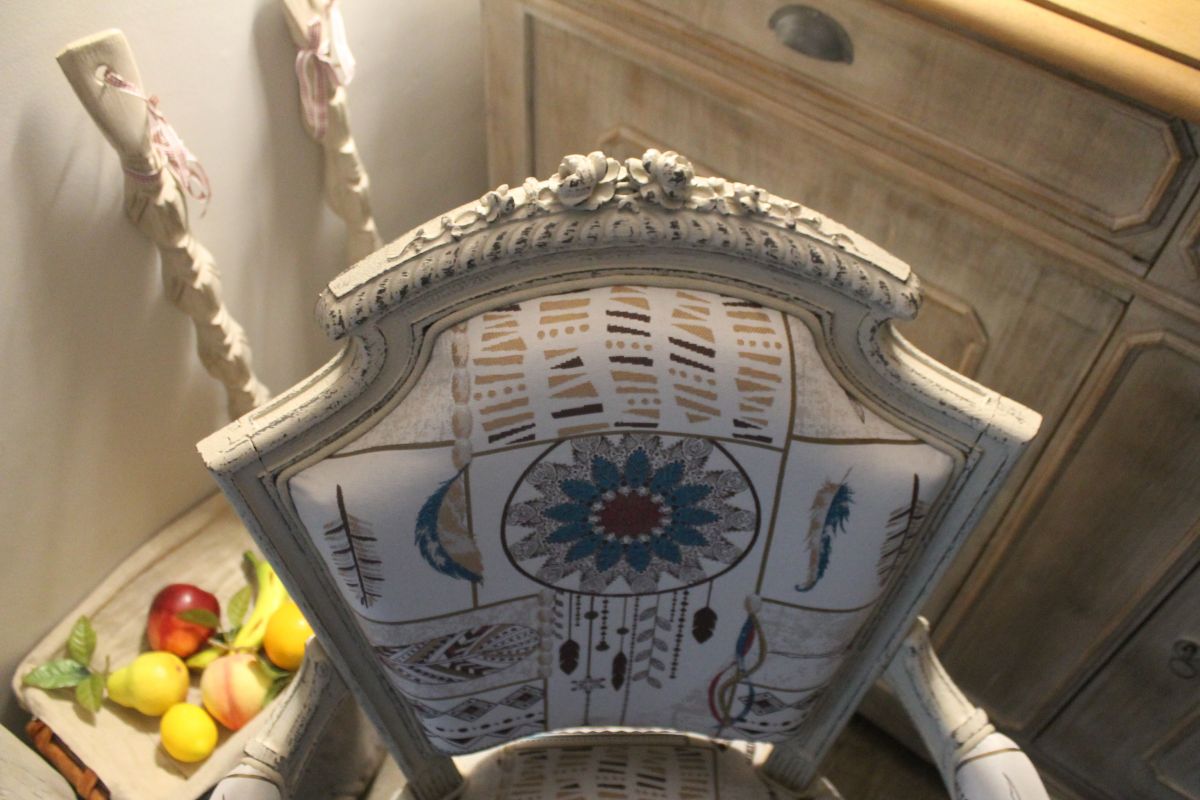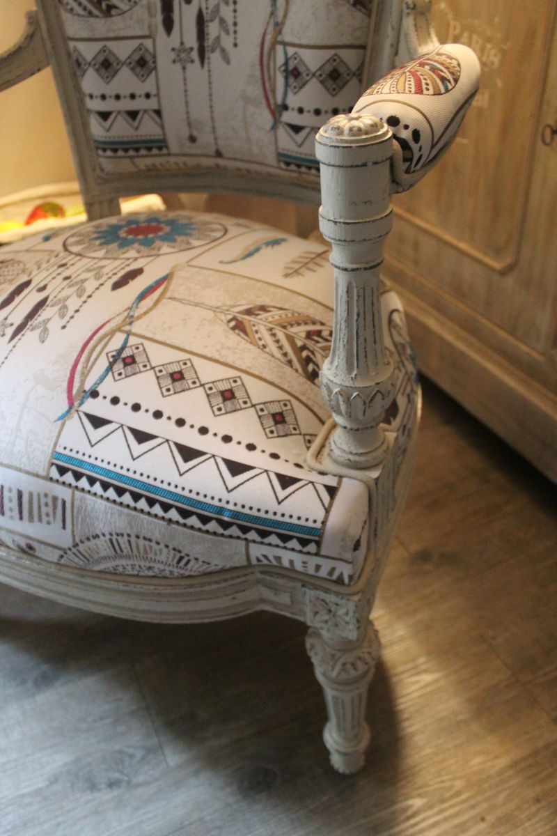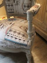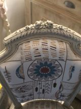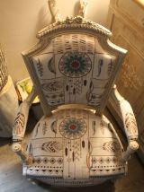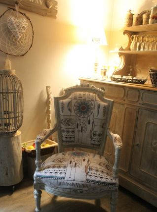 Fauteuil en palissandre du 19 ème siècle, fabriqué par un ébéniste de Cannes en 1894 pour le compte d'un riche aristocrate. Ce fauteuil maintenant est recouvert d'une patine fusain et lin fondu dominent, avec une tapisserie moderne d'un style indien pourvu d'attrape rêves et de plumes.