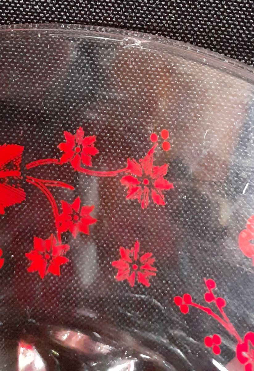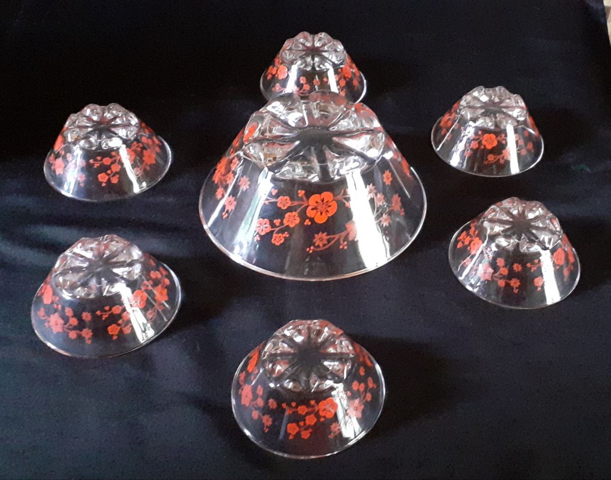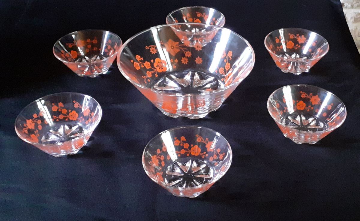Saladier et coupelles en verre transparent avec des motifs de fleurs rouges. Année 80.