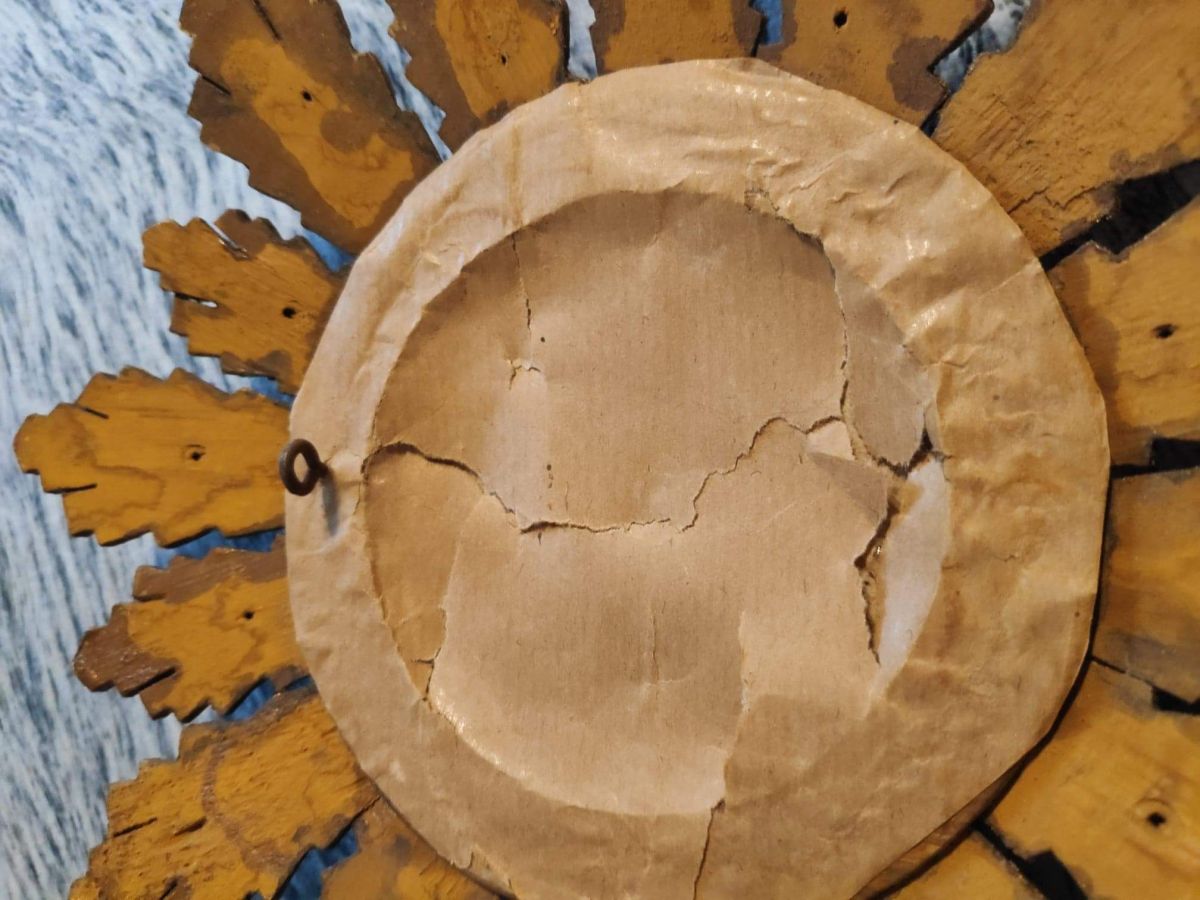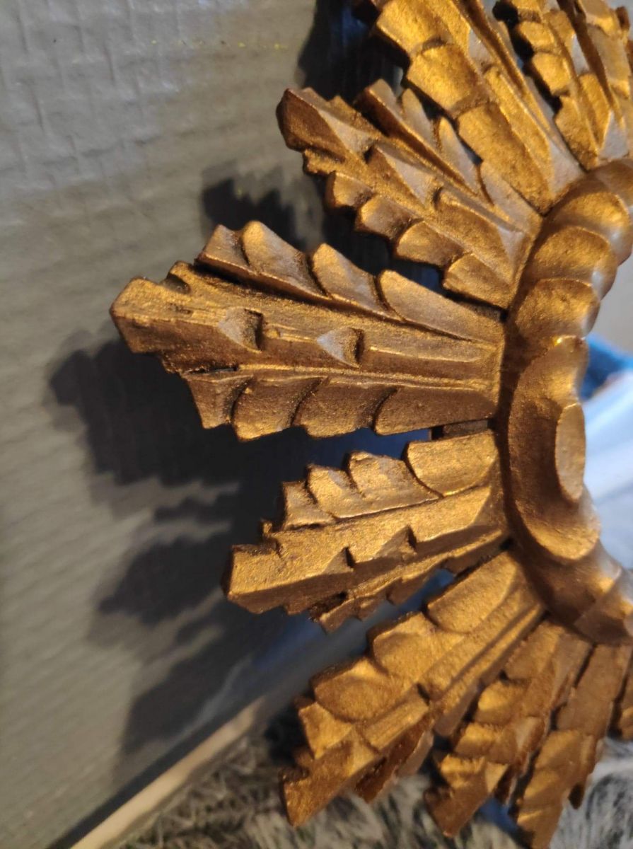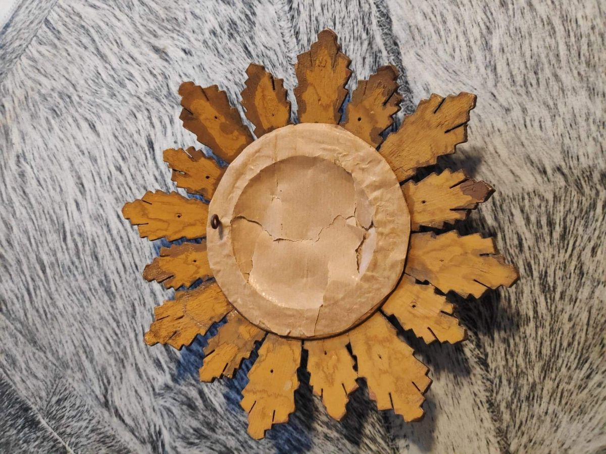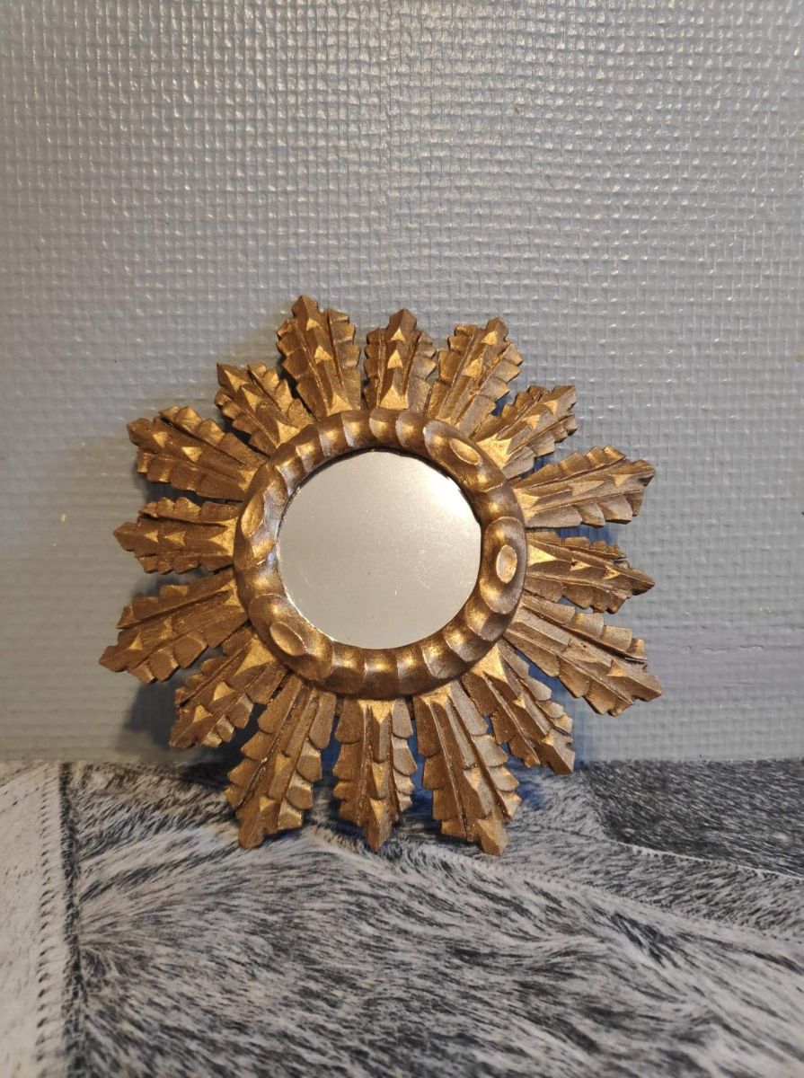 Rare et joli miroir soleil en bois doré avec crochet pour compléter votre décoration murale