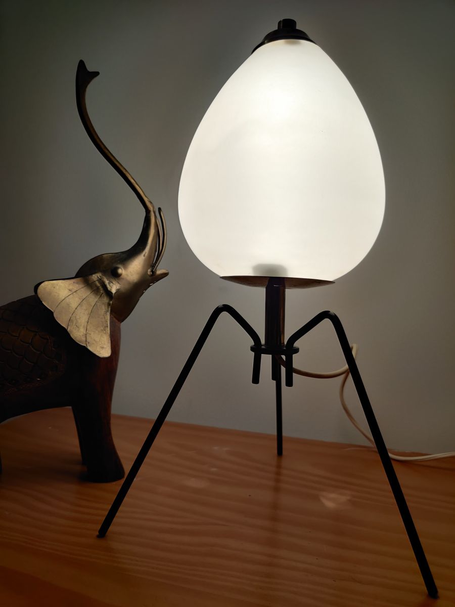 Lampe circa années 60 produite à Milan (Italie) avec la tête en opaline blanche (sans aucun fêle, rayure...), fixation haut et bas de l'opaline en laiton et tripode en acier noir.