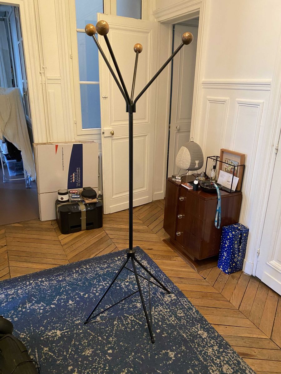Je vends un porte-manteaux vintage en très bon état. Il possède 4 boules de bois vernis et un piétement métal noir.