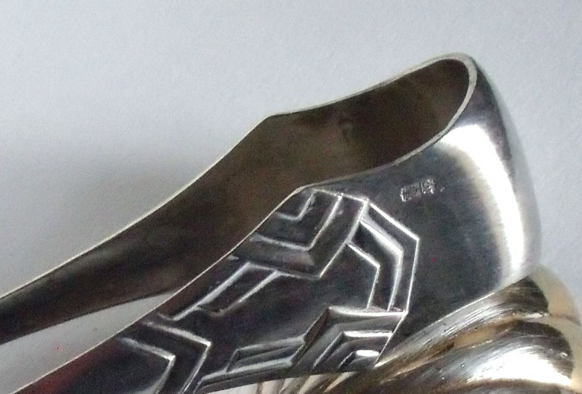 La pince à sucre est en Bon Etat et il n'y a aucune trace de désargenture . Comporte un poinçon "METAL BLANC" et un autre avec "2e", sur l'autre côté de la pince un autre poinçon que je n'arrive pas à lire (sans doute les initiales de l'orfèvre). Elle fait 13 cm de longueur pour un poids de 39 g. Décor typique Art Déco