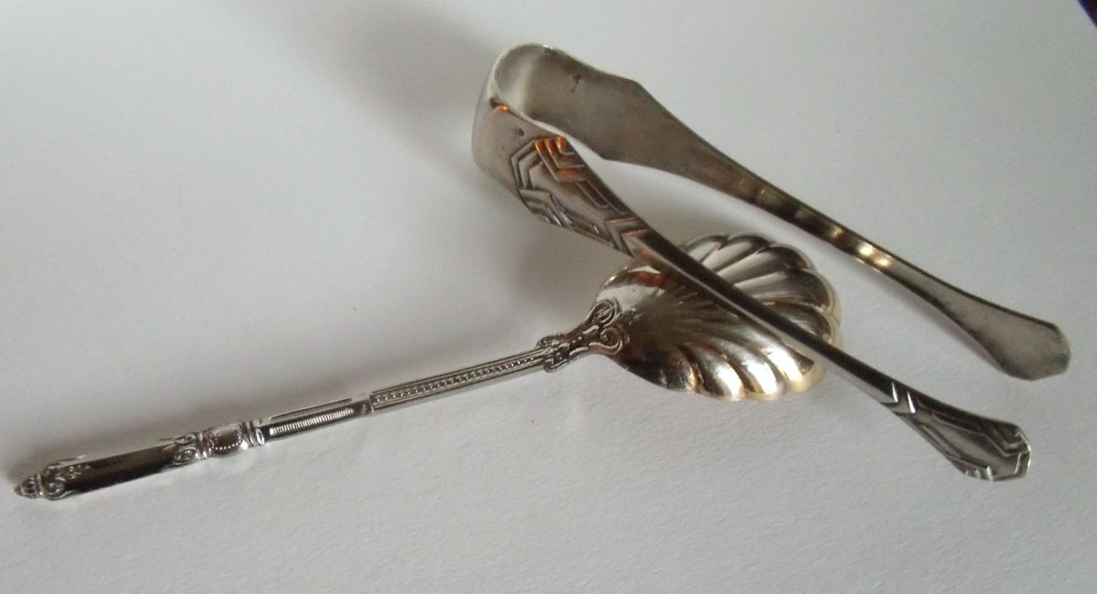 Pince à sucre Art Déco métal argenté + jolie Cuillère à frai