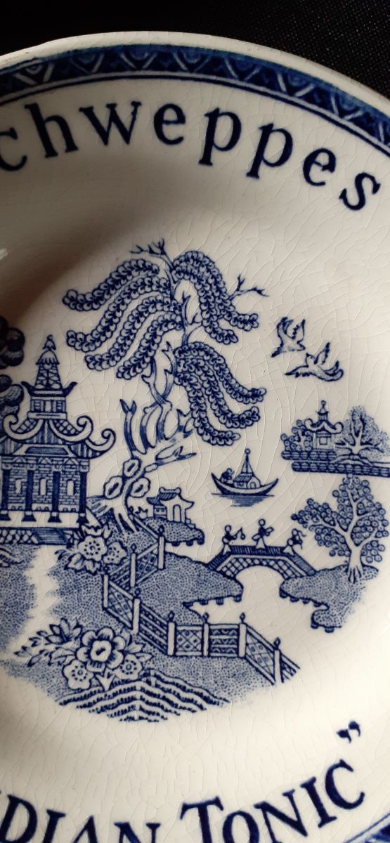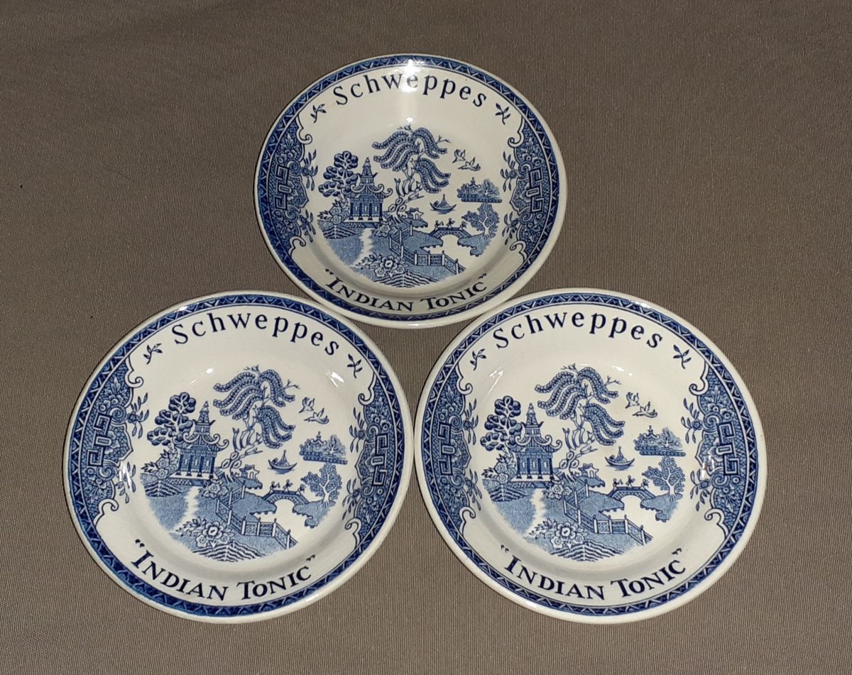 3 soucoupes de pourboire/ vide poche/ coupelles cacahuètes publicitaire Schweppes "Indian Tonic"en faïence blanche et bleue de Gien avec décor asiatique bleu. Vintage années 60-70.