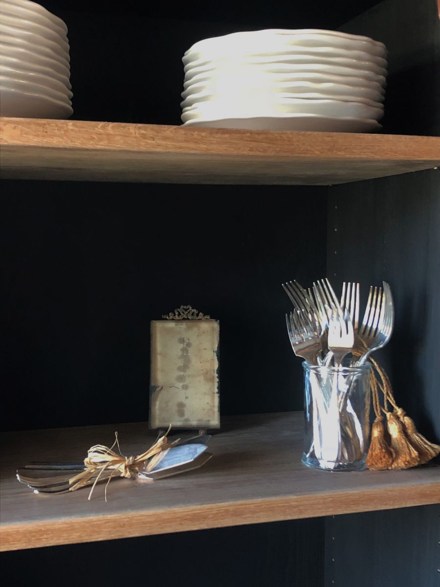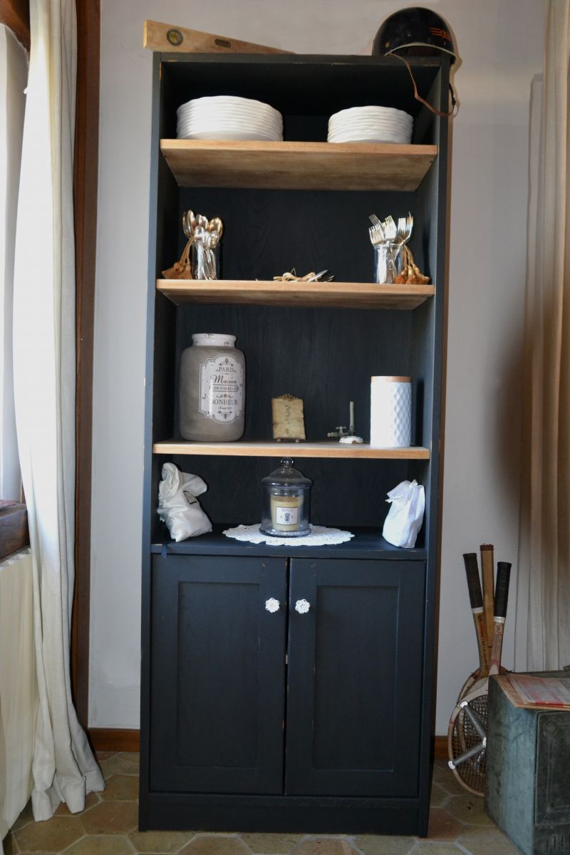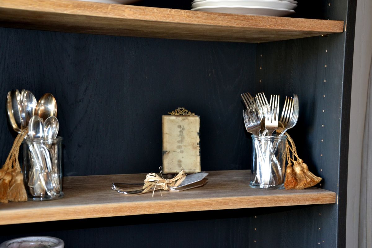 Très haute, elle accueille livres, vaisselle et beaux objets de décoration.