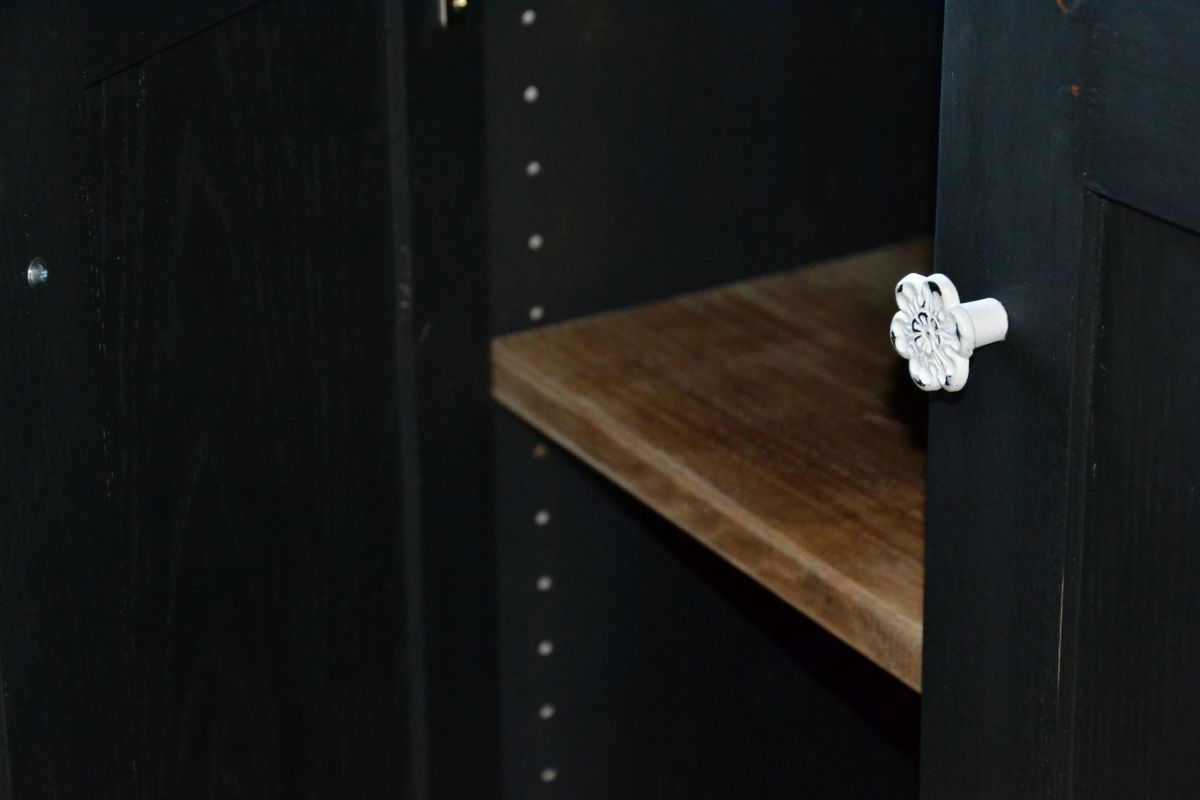 Partie basse avec 2 portes, à l’intérieur 1 étagère amovible et réglable en hauteur