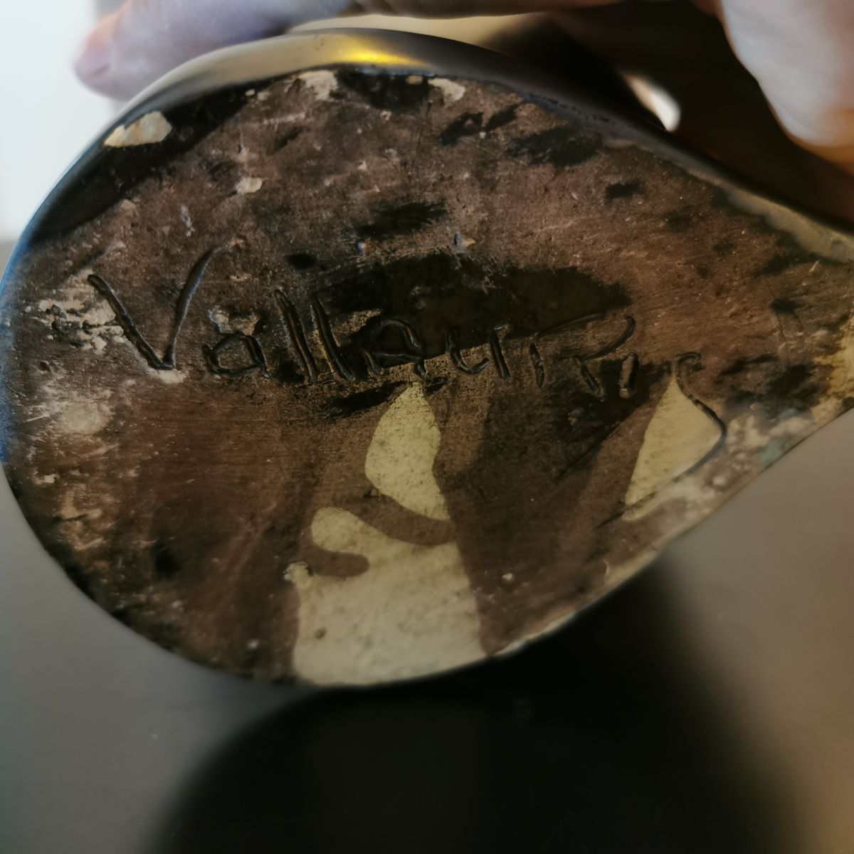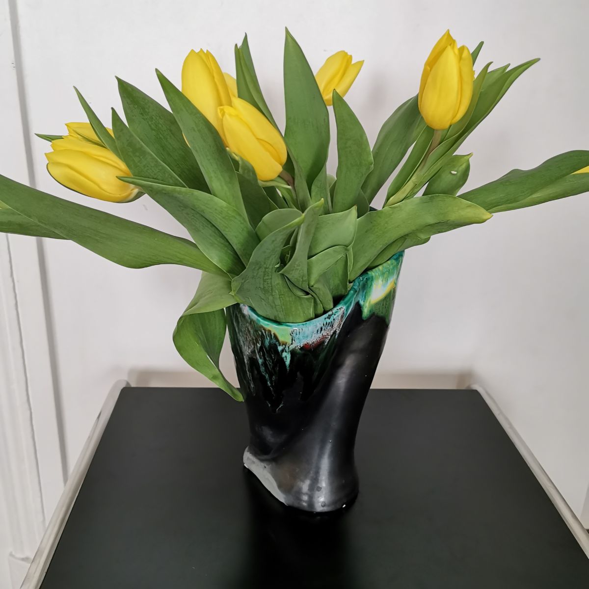 Très joli vase Vallauris fait à la main (voir photo avec la signature) en céramique lustrée noire et torsadée. Le vase a également de la couleur vernis sur le contour du haut ainsi qu'à l'intérieur avec un éventail de couleurs incroyables. Il doit certainement daté des années 50/60. La couleur mat lui donne un côté contemporain. C'est un vase qui a beaucoup de caractère,bel élément de décoration.