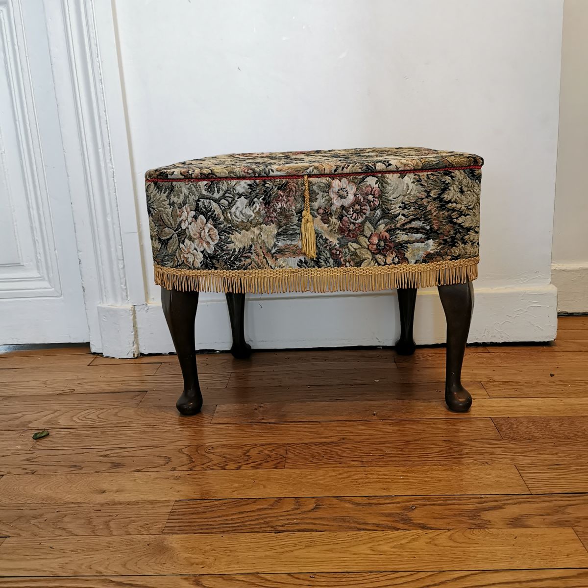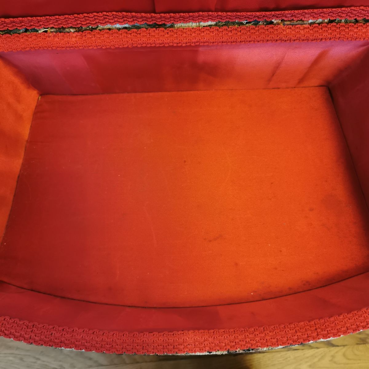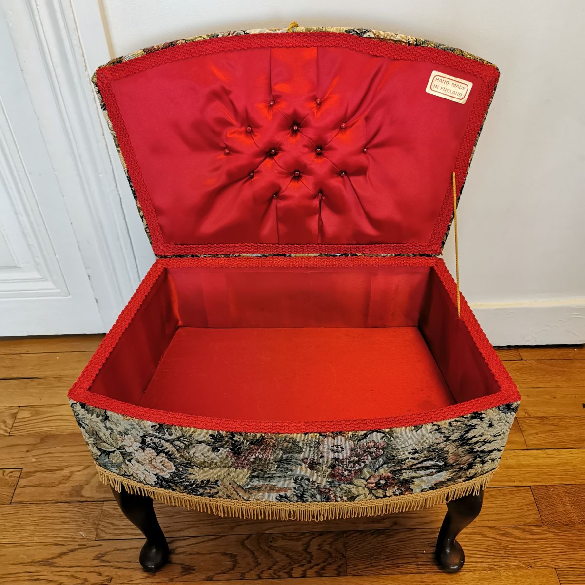 Jolie couseuse made in england en très bon état. Elle peut servir de couseuse ou tout simplement de petit rangement. La travailleuse est en bois recouverte d'une tapisserie à l'extérieur et d'un satin et galon rouge à l'intérieur. Elle donne une touche rétro dans un univers contemporain. Dimensions l 49 h 39 p 29 cm.